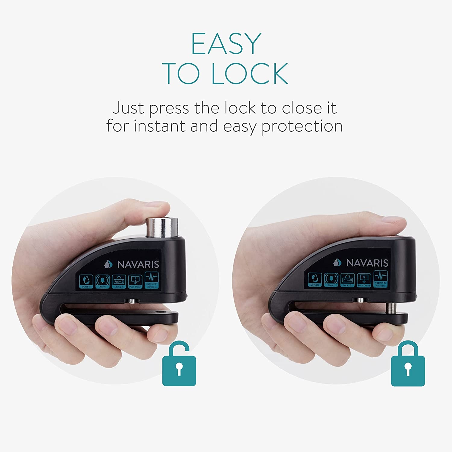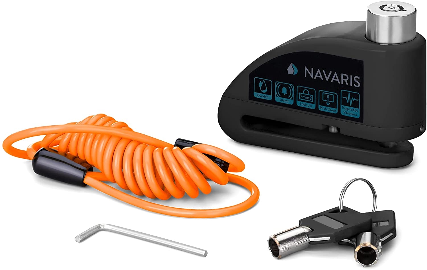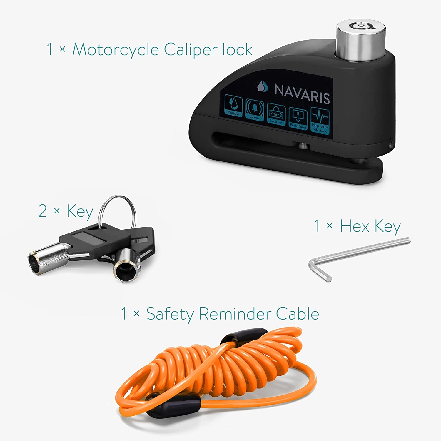 Παρκάρετε τη μοτοσικλέτα ή το σκούτερ σας χωρίς να ανησυχείτε για κάποια ενδεχόμενη κλοπή. Η κλειδαριά δισκόφρενου με συναγερμό της Navaris παρέχει ένα αποτελεσματικό αντικλεπτικό σύστημα, με ένα σήμα συναγερμού που απενεργοποιείται όταν αφαιρέσετε την κλειδαριά.