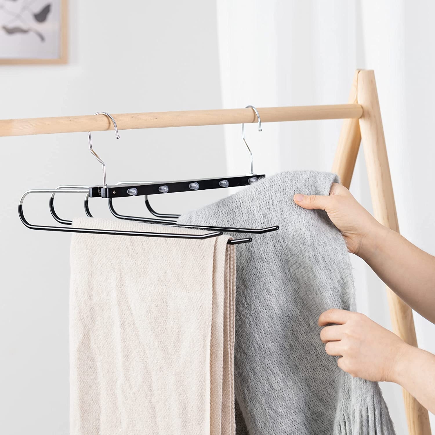 Μπορείτε να κρεμάσετε έως 5 παντελόνια σε καθεμία από αυτές τις κρεμάστρες. Μπορείτε εύκολα να εξοικονομήσετε χώρο στις ντουλάπες σας, εξασφαλίζοντας ότι πλέον το παντελόνι σας δεν θα τσαλακωθεί ή θα κάνει ανεπιθύμητα τσακίσματα.