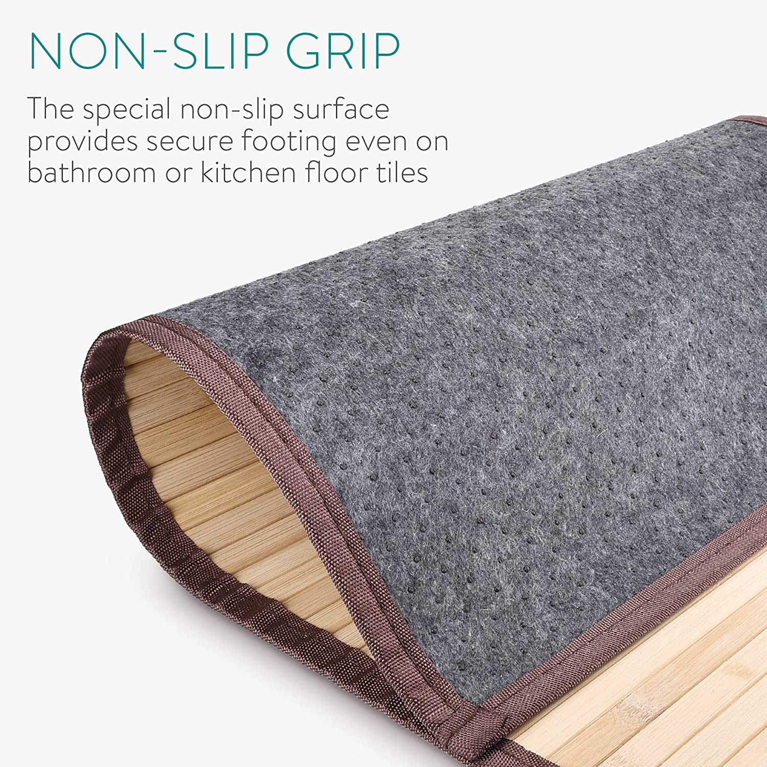 Η αντιολισθητική επιφάνεια του χαλιού προσφέρει σταθερή πρόσφυση είτε το τοποθετήσετε μπροστά από το νεροχύτη, το ντους ή την μπανιέρα. Το υδατοαπωθητικό χαλάκι από μπαμπού είναι ιδανικό για χρήση στο πάτωμα του μπάνιου, είναι ανθεκτικό στο νερό και παραμένει στεγνό.