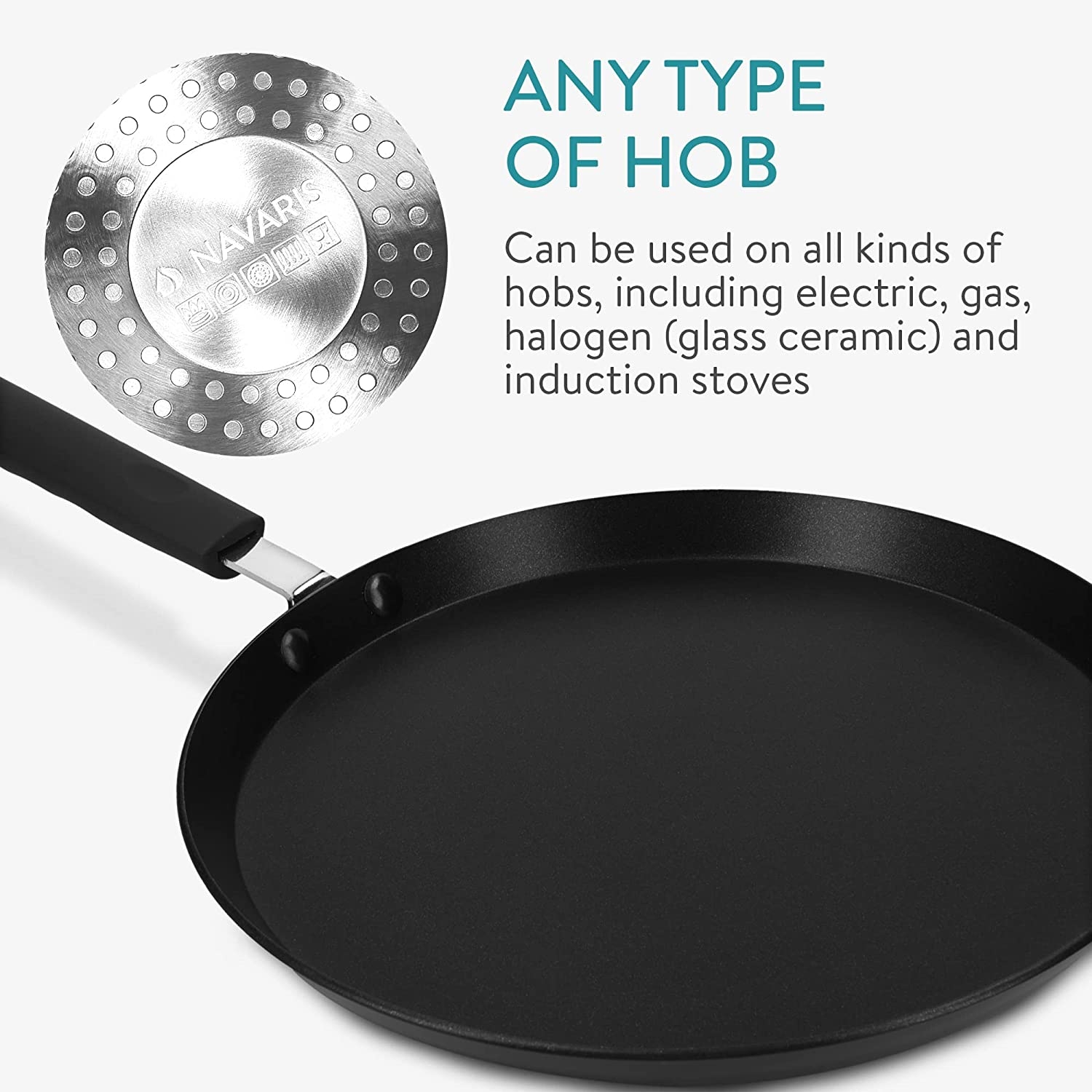 Αναβαθμίστε τη μαγειρική σας με το αντικολλητικό τηγάνι της Navaris, το οποίο είναι ιδανικό για να φτιάξετε τηγανίτες, κρέπες, ομελέτες και τορτίγιες. Διαθέτει αντικολλητική επίστρωση και χαμηλό χείλος γύρω από την άκρες του τηγανιού, ώστε να γυρίστε ή να βγάλετε από το τηγάνι τις κρέπες σας!