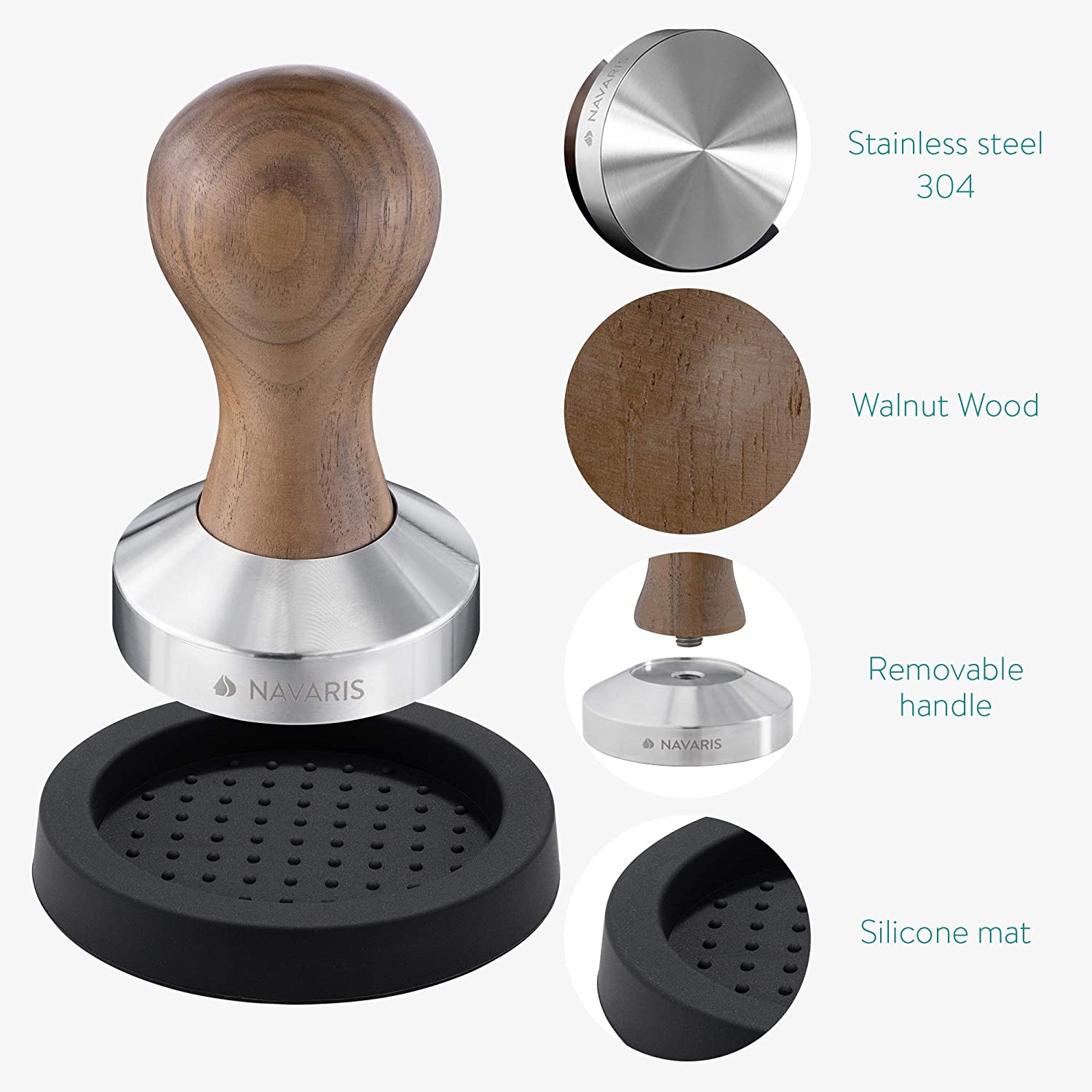 Το πατητήρι είναι κατασκευασμένο από ανοξείδωτο ατσάλι με εργονομική λαβή από φυσικό ξύλο, δεν είναι μόνο σχεδιασμένο για να παρέχει άνεση κατά τη χρήση, αλλά επίσης προσθέτει ένα άγγιγμα κομψότητας σε αυτή τη ξεχωριστή εμφάνιση. Όταν δε χρησιμοποιείτε το πατητήρι, τοποθετήστε το στη βάση σιλικόνης.