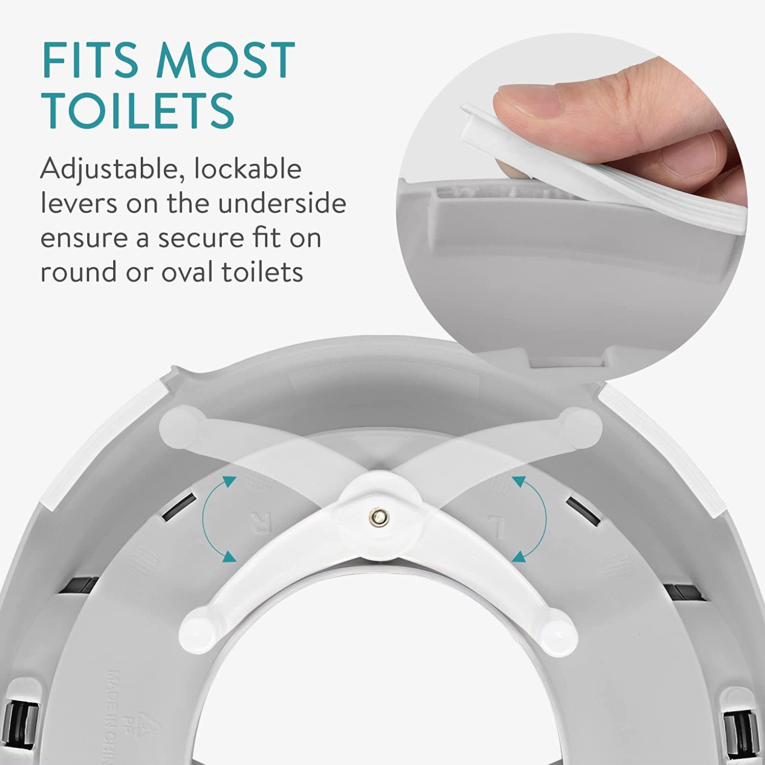 Ρυθμίστε τους 2 μοχλούς στο κάτω μέρος, πρώτα το L και μετά το R και μετά σφίξτε για να το ασφαλίσετε. Οι μοχλοί κλειδώνουν και εξασφαλίζουν ασφαλή εφαρμογή σε στρογγυλές ή οβάλ τουαλέτες, για να ταιριάζουν στο κάθισμα της τουαλέτας. Η μαλακή επένδυση από αφρώδες υλικό συγκρατείται με τις συνδέσεις, ενώ ταυτόχρονα αφαιρείται εύκολα.