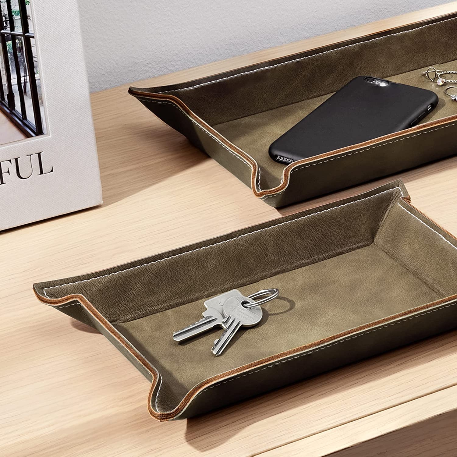 Οργανώστε όλα σας τα μικροαντικείμενα όπως κλειδιά, πορτοφόλια, τηλέφωνα, κοσμήματα, χρήματα και πολλά άλλα με το κομψό σετ από δίσκους της Navaris. Οι δίσκοι είναι κατασκευασμένοι υψηλής ποιότητας ανθεκτικό PU δέρμα και στιβαρό μέταλλο και ταιριάζουν υπέροχα σε κάθε κομοδίνο ή γραφείο!