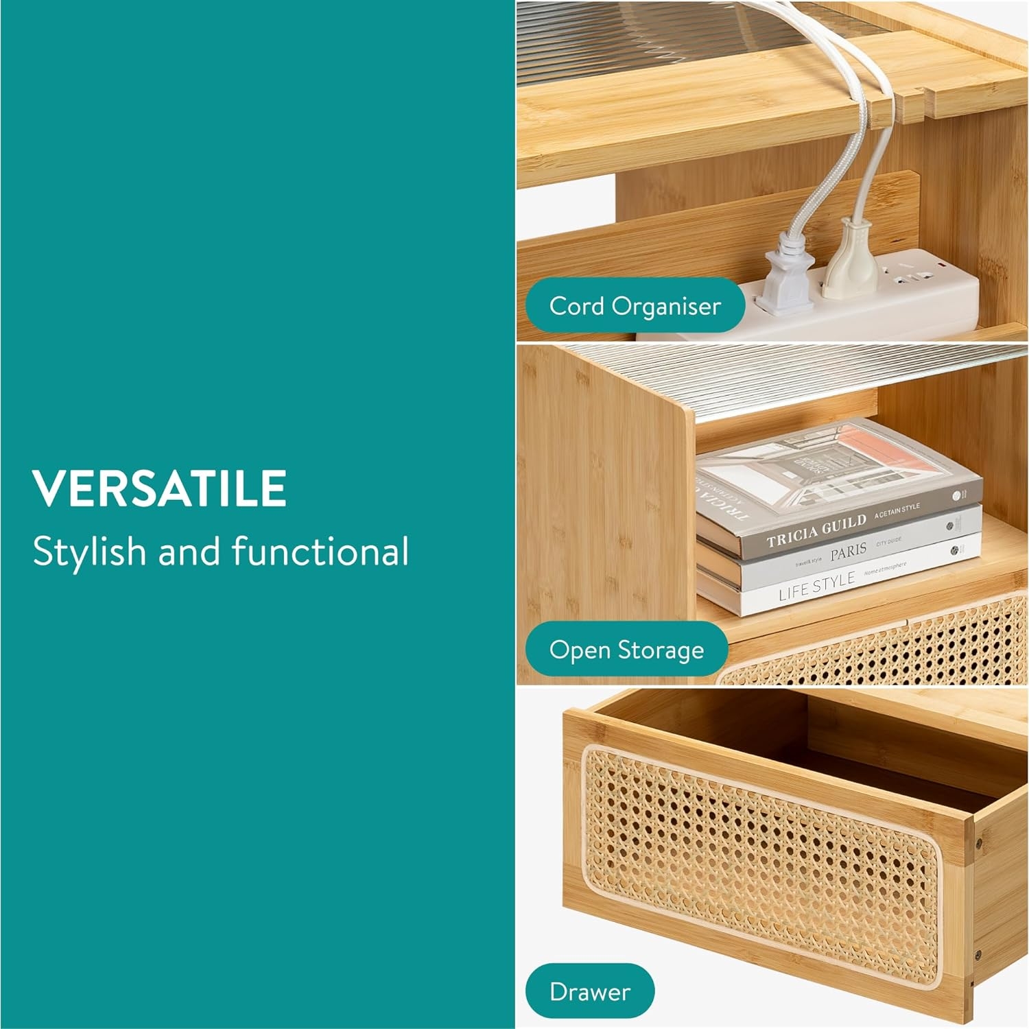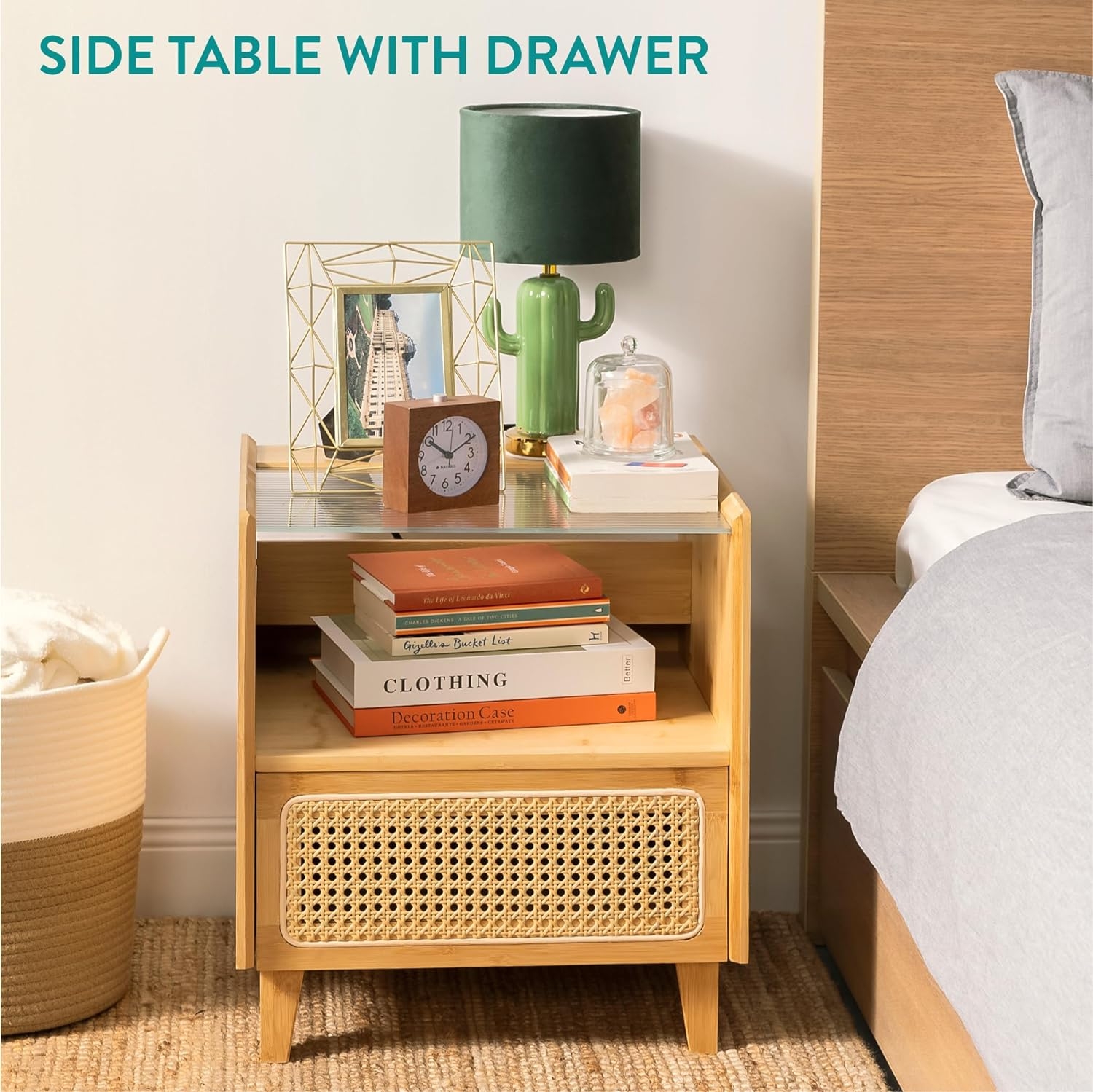Navaris Rattan Nightstand - Ρουστίκ Κομοδίνο με Συρτάρι από Μπαμπού / Ρατάν & Γυαλί - 40 x 42.5 x 49.5 cm - Brown (54441.01)