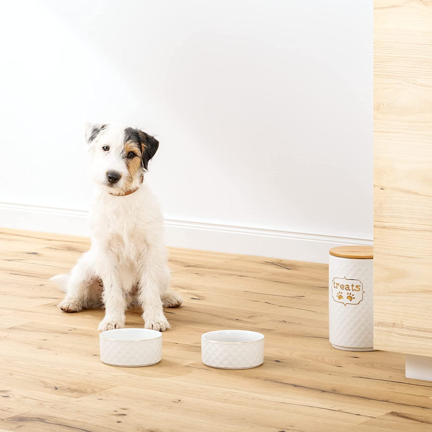 Η γατούλα και ο σκύλος σας θα ενθουσιαστούν μόλις δουν αυτό το όμορφο κεραμικό σετ για τις λιχουδιές τους! Το σετ της Navaris περιλαμβάνει ένα δοχείο αποθήκευσης και δύο μπολ φαγητού ώστε να μπορείτε να σερβίρετε πεντανόστιμες λιχουδιές αμέσως. Τα κεραμικά μπολ για κατοικίδια είναι ιδανικά για να σερβίρετε γεύματα, λιχουδιές και νερό σε γάτες ή μικρά σκυλιά.