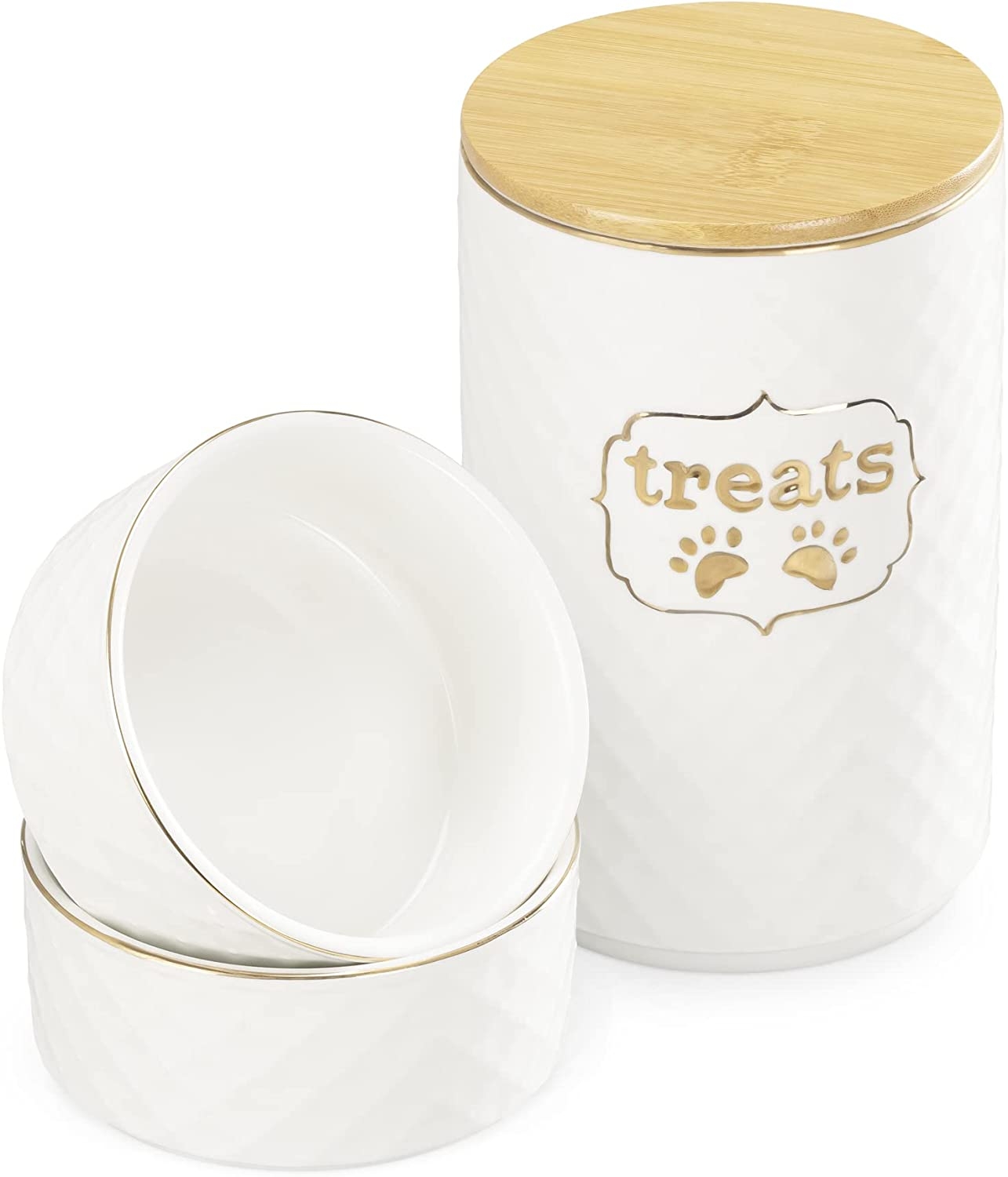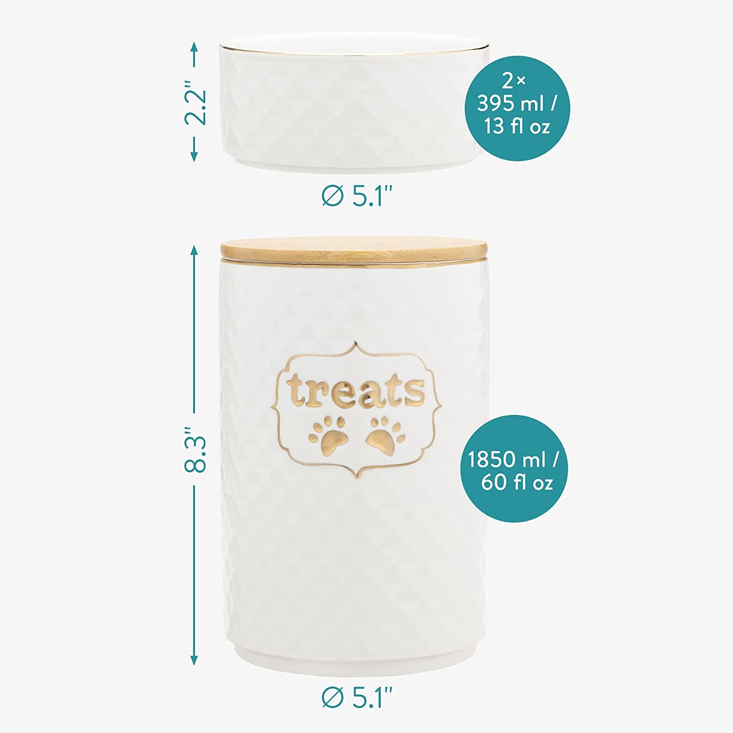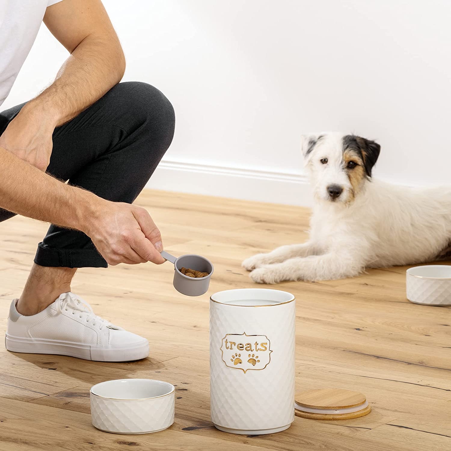 Τα κατοικίδια σας θα έρθουν τρέχοντας όταν σας δουν να βγάζετε το δοχείο και να ετοιμάζεστε να γεμίσετε το μπολ τους με λιχουδιές! Ταιριάζουν τέλεια στον πάγκο της κουζίνας σας, ενώ είναι χαριτωμένα και λειτουργικά. Αυτό το σετ είναι η ιδανική λύση για να διατηρείτε τα κεράσματα των χνουδωτών σας φίλων φρέσκα και αποθηκευμένα ασφαλώς!