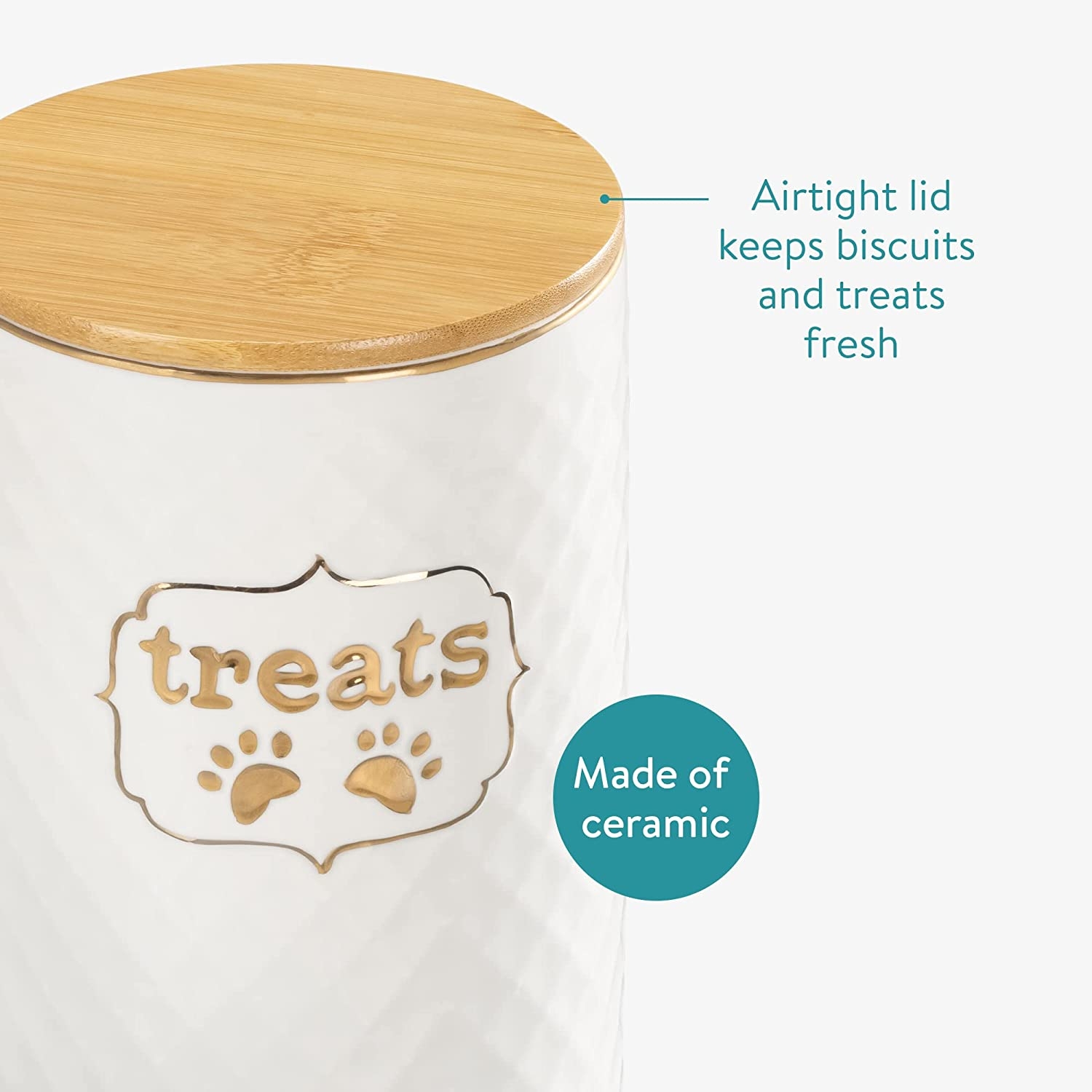 Αντί να ασχολείστε με ακατάστατες ανοιγμένες συσκευασίες, αποθηκεύστε τα αγαπημένα σνακ του σκύλου ή της γάτας σας σε αυτό το όμορφο δοχείο. Το δοχείο διαθέτει ένα αεροστεγές καπάκι που βοηθά στη φρεσκάδα των μπισκότων και των λιχουδιών των κατοικιδίων σας και δεν χρειάζεται πλέον να ανησυχείτε μήπως τα τρόφιμα μπαγιατέψουν.