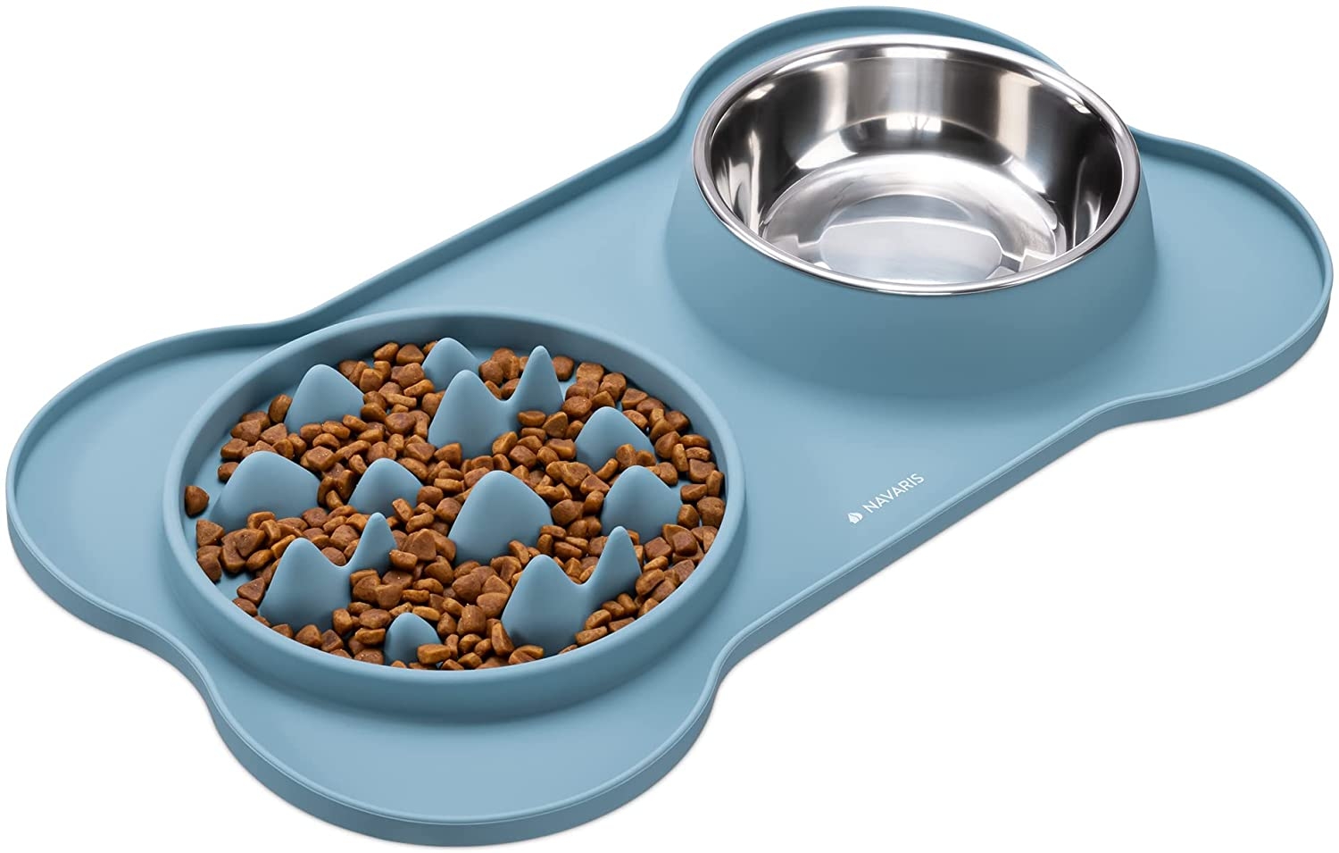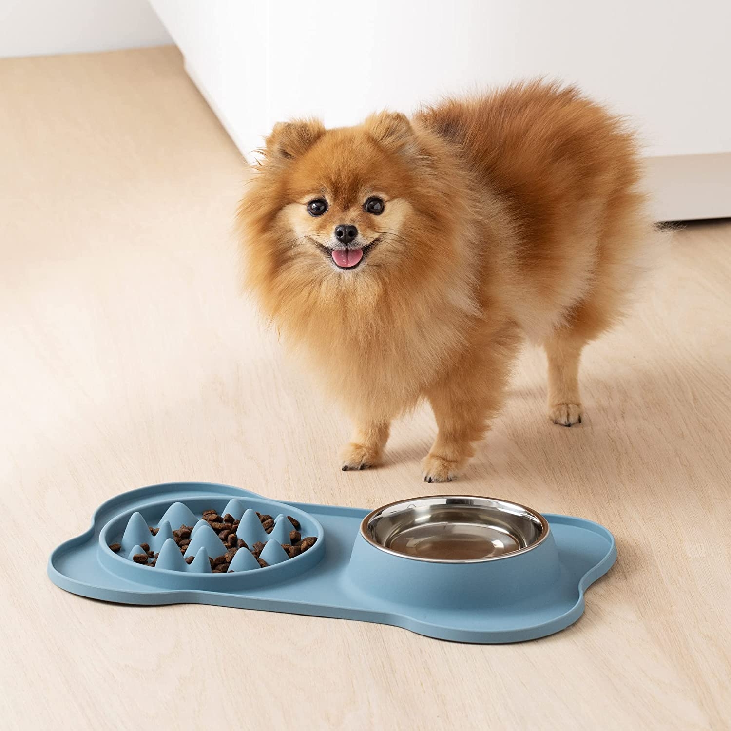Αυτή η βάση σιλικόνης με το μπολ αργής κατάποσης, βοηθά τον σκύλο σας και την γάτα σας να τρώει πιο αργά και έτσι βελτιώνει την πέψη του. Είναι κατάλληλο για ξηρή και υγρή τροφή. Γεμίστε το μπολ από ανοξείδωτο ατσάλι με νερό και τοποθετήστε το φαγητό στο μπολ σιλικόνης. Έτσι, η τροφή του σκύλου σας είναι διαθέσιμη σε ένα μέρος για εξοικονόμηση χώρου.