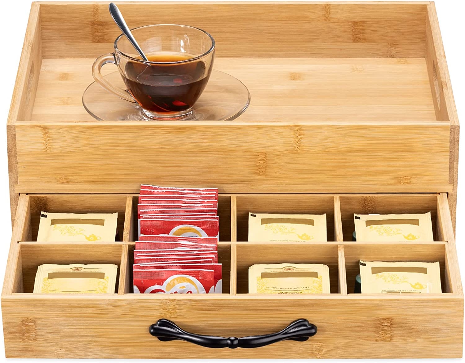 Ταιριάζει σε κάθε κουζίνα, είναι φιλικό στο περιβάλλον και δίνει μια φυσική και ελκυστική εμφάνιση. Επίσης, εκτός από φακελάκια τσάι, μπορείτε να αποθηκεύσετε και κάψουλες καφέ. Σας προσφέρει εύκολη πρόσβαση καθώς το συρτάρι ανοίγει και κλείνει με ευκολία χάρη στο ειδικό χερούλι. Αποτελεί ένα υπέροχο δώρο για τους λάτρεις του τσαγιού!