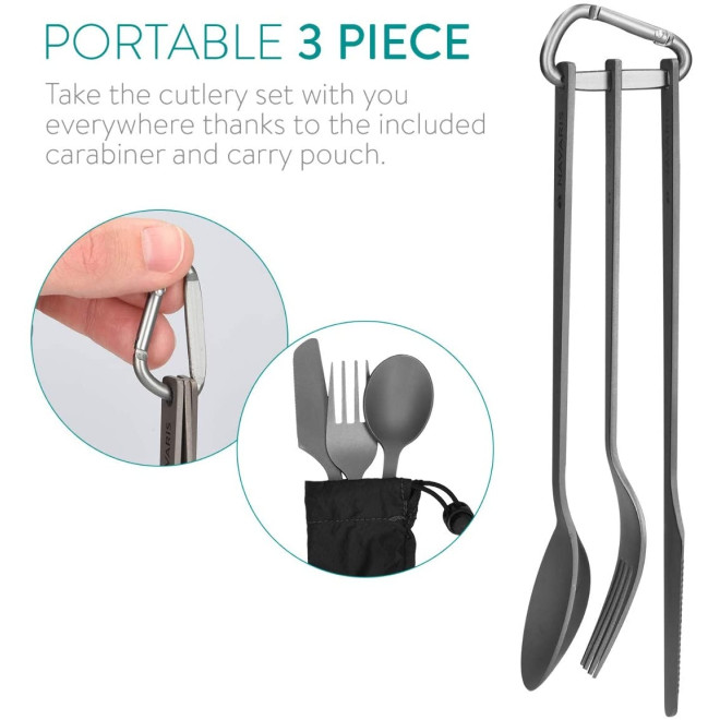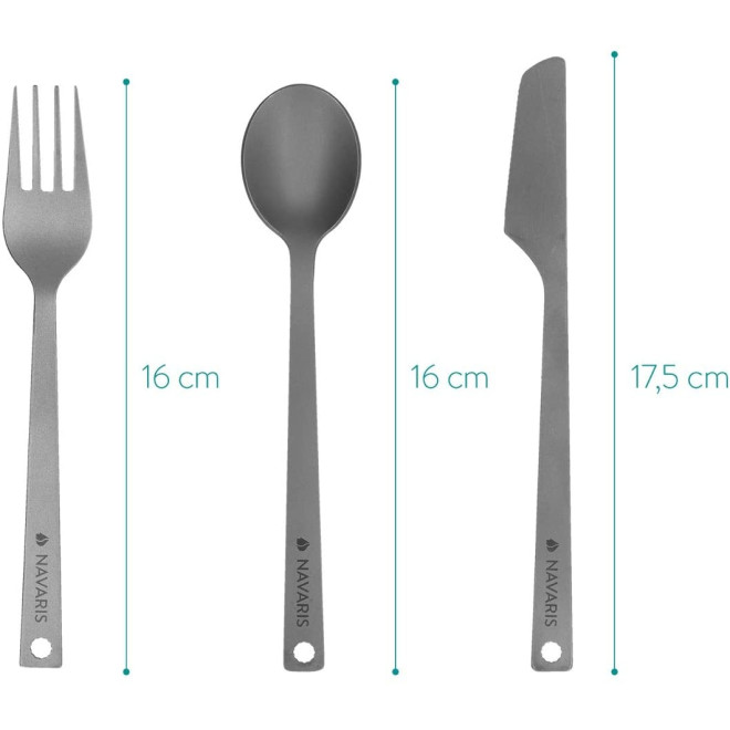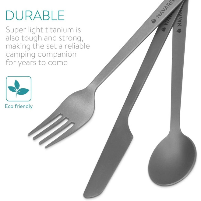 Το εξαιρετικά ελαφρύ σετ από μαχαιροπίρουνα τιτανίου της Navaris είναι ιδανικό για κάμπινγκ, πεζοπορία, πικ-νικ ή για να τρώτε το αγαπημένο σας γεύμα στην εργασία σας.