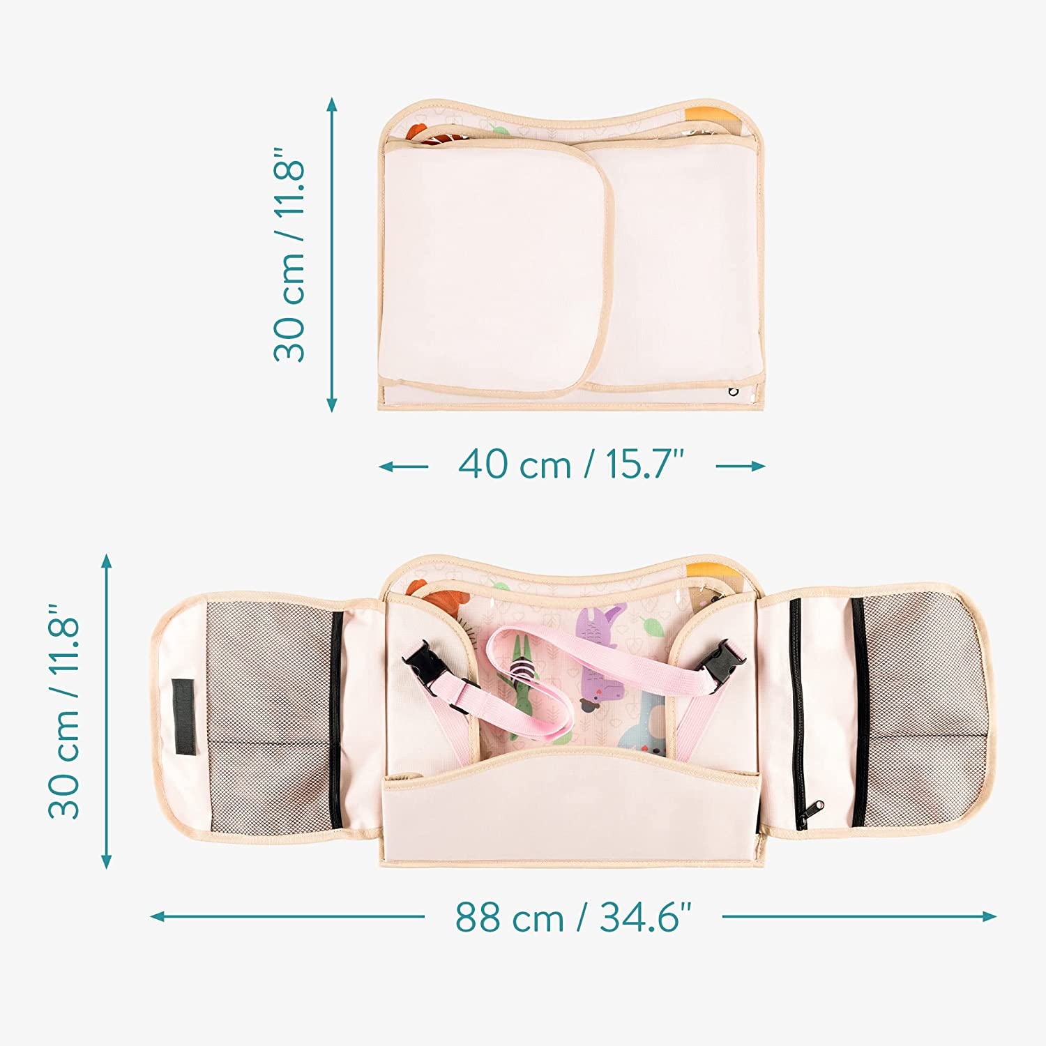 Μπορεί να χρησιμοποιηθεί ως δίσκος για σνακ ή παιχνιδιού για το κάθισμα του αυτοκινήτου ή ως τραπέζι. Οι τσέπες με ελαστικό πλέγμα είναι κατάλληλες για αποθήκευση παιχνιδιών, βρεφικών μαντηλιών, πιπίλες, πάνες, μπουκάλια ή σνακ.