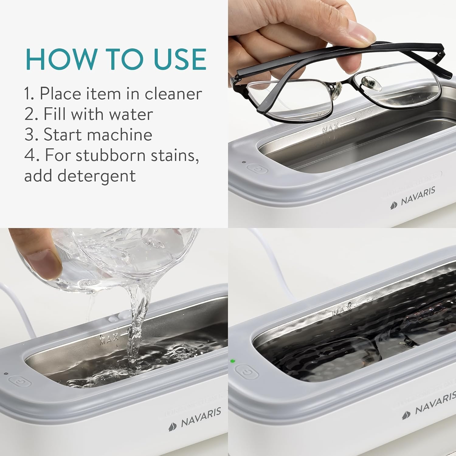 Η διαδικασία καθαρισμού είναι πολύ εύκολη, εσείς απλά τοποθετήστε το αντικείμενο στον καθαριστή, γεμίστε τη συσκευή με νερό, εκκινήστε την συσκευή και για επίμονους λεκέδες, προσθέστε απορρυπαντικό. Η συσκευή θα απενεργοποθεί αυτόματα μετά από 3 λεπτά. Απολαύστε καθαρά και λαμπερά αντικείμενα με τη συσκευή καθαρισμού υπερήχων της Navaris, την ιδανική λύση για έναν αποτελεσματικό και ασφαλή καθαρισμό!
