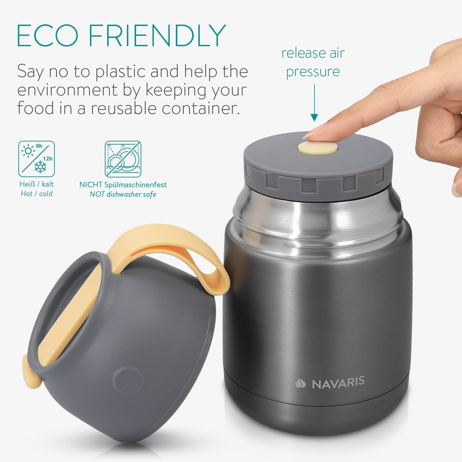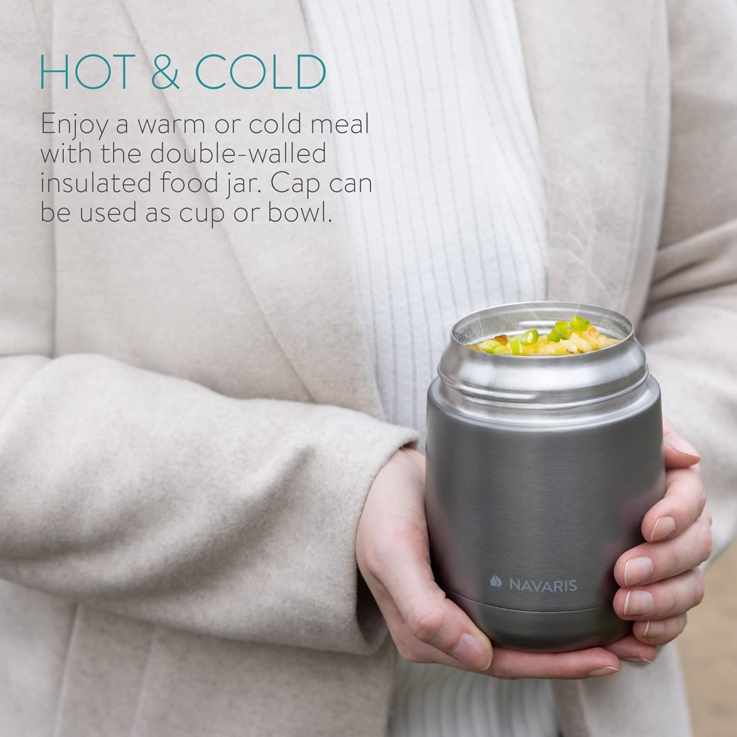 Με το Vacuum Insulated Food Jar της Navaris μπορείτε να απολαύσετε το ποτό ή το γεύμα σας όπου και αν βρίσκεστε. Χάρη στην μεταλλική κατασκευή, το περιεχόμενο μένει κρύο ή ζεστό για περισσότερη ώρα.