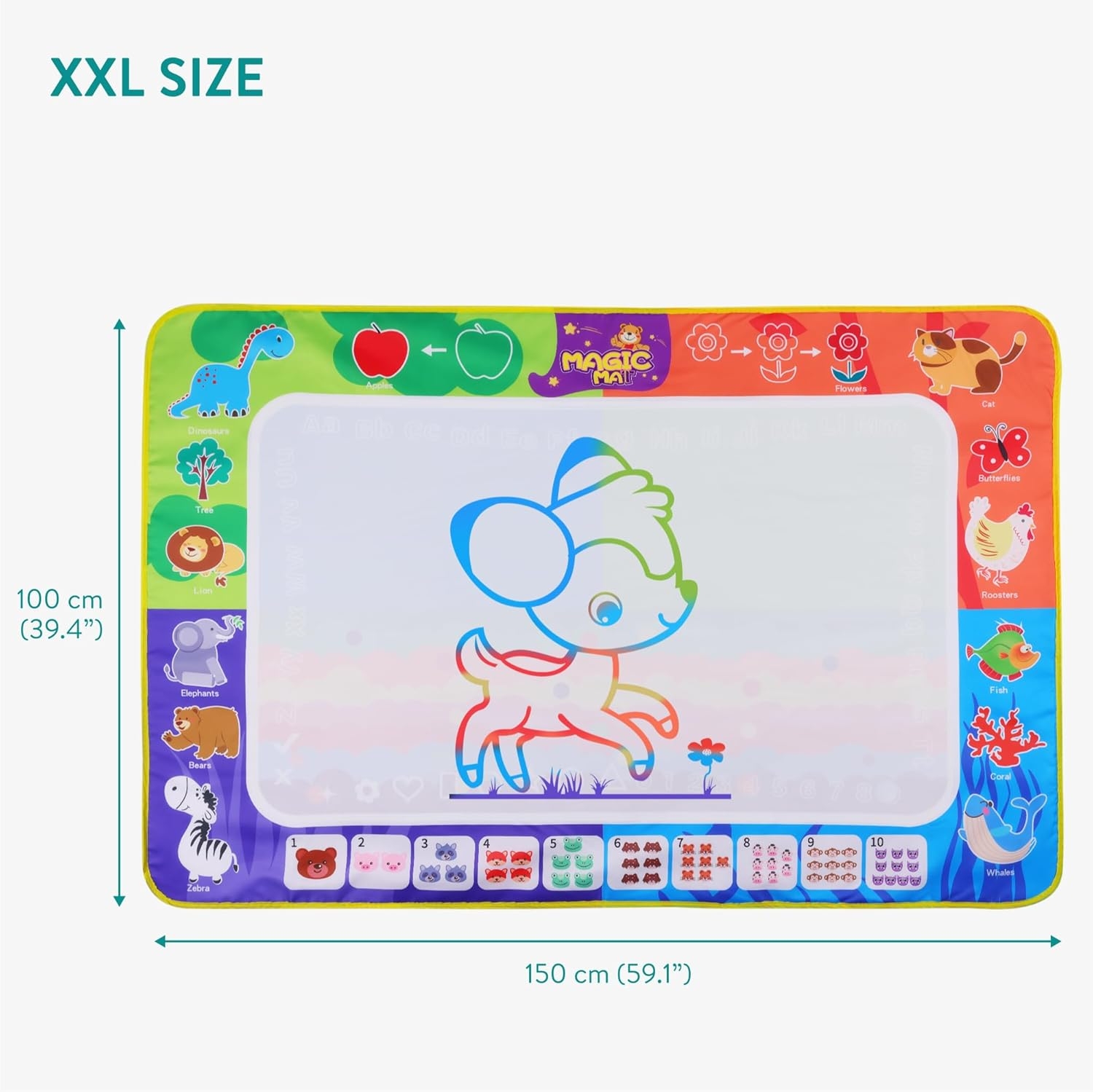 Αυτό το XXL χαλάκι αποτελεί μια μοναδική εμπειρία που καλλιεργεί τις καλλιτεχνικές δεξιότητες, παρέχοντας στα παιδιά σας μια επιφάνεια για να σχεδιάζουν και να χρωματίζουν με ασφάλεια. Το σετ περιλαμβάνει 2 μαρκαδόρους νερού, οι οποίοι γεμίζουν απλά με νερό και αποκαλύπτουν μαγικά έντονα χρώματα πάνω στο χαλάκι, τα οποία εξαφανίζονται μόλις στεγνώσουν και έτσι είναι έτοιμα για να ξαναχρησιμοποιηθούν.