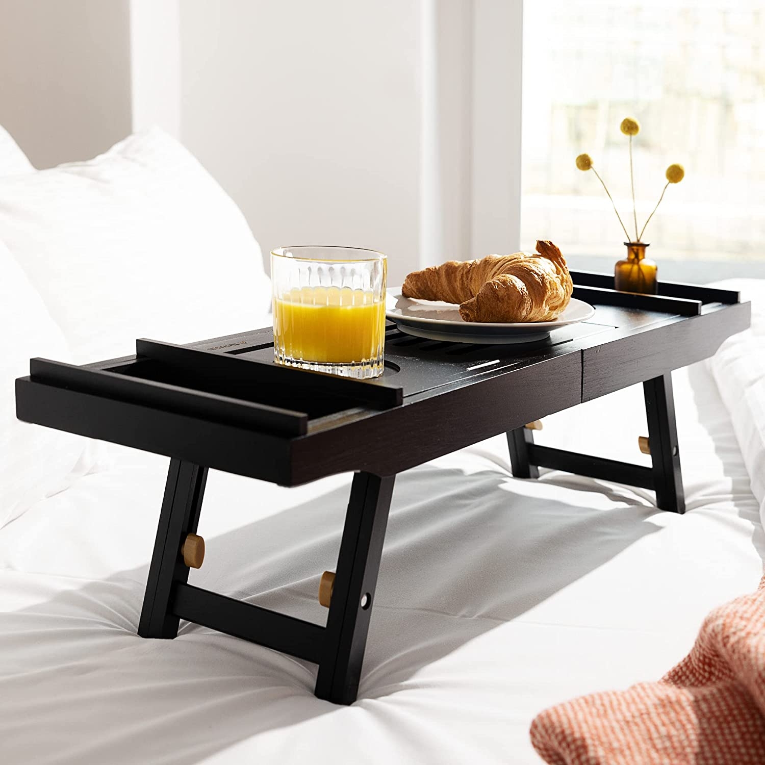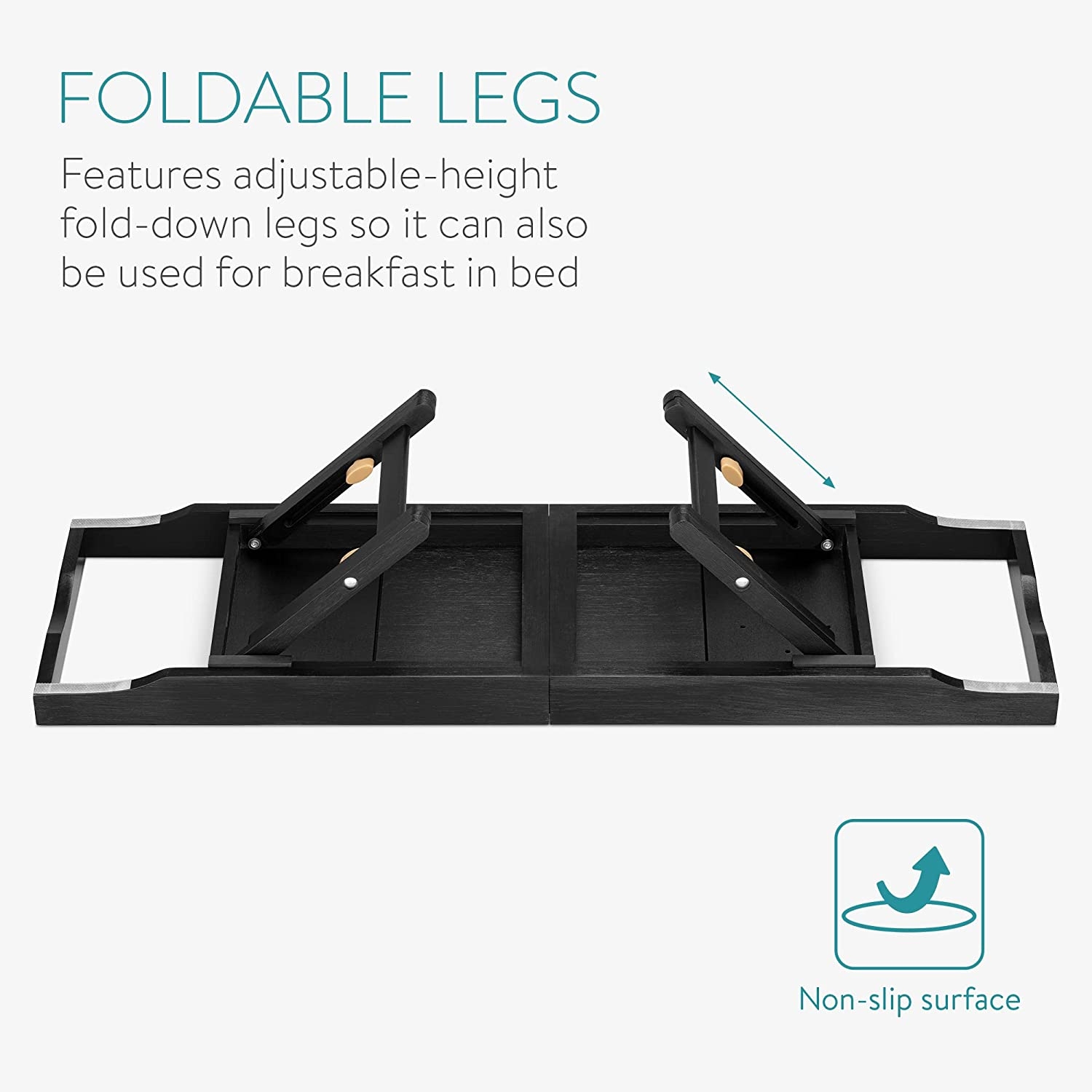 Οι πλευρές της ξύλινης βάσης επεκτείνονται προς τα έξω για τέλεια εφαρμογή στην μπανιέρα. Μπορεί επίσης, να χρησιμοποιηθεί στο κρεβάτι ως δίσκος σερβιρίσματος. Απλώς ξεδιπλώστε τα πόδια και μπορείτε να απολαύσετε ροφήματα και φαγητό, ενώ διαβάζετε ή παρακολουθείτε ταινία στο tablet σας.