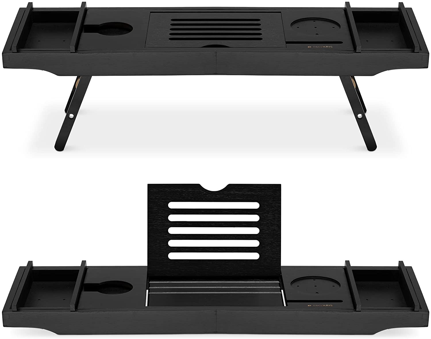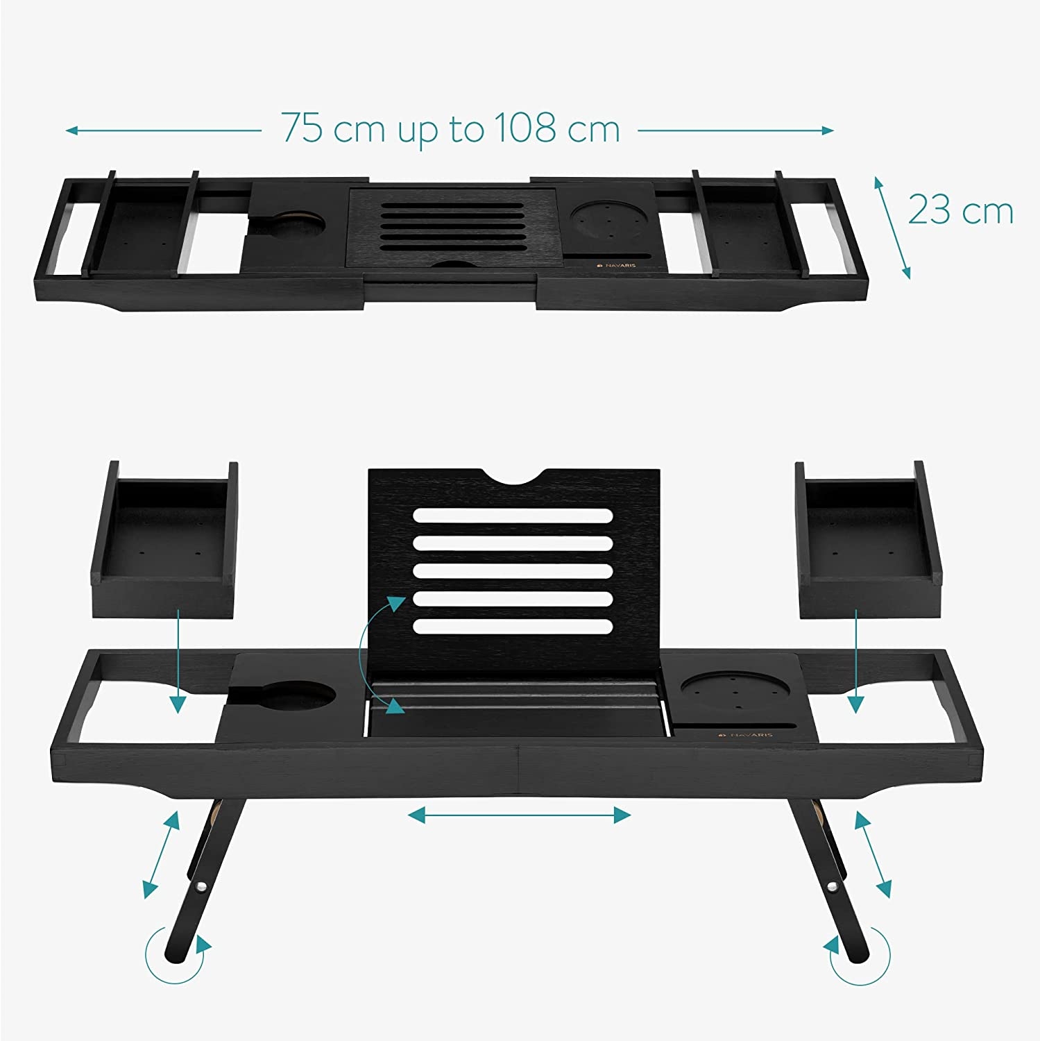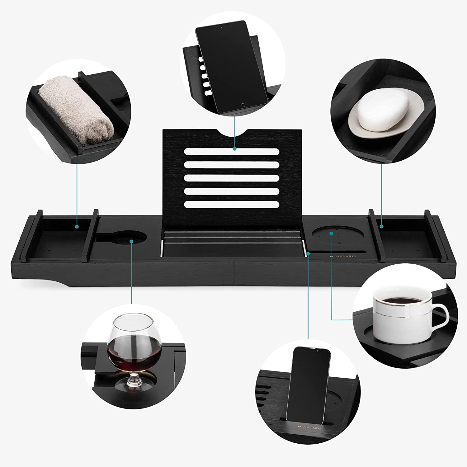 Χαρίστε στον εαυτό σας μια μοναδική εμπειρία spa στο σπίτι με την ξύλινη βάση,σε χρώμα Black, για τη μπανιέρα της Navaris. Βυθιστείτε σε μια πλήρη εμπειρία περιποίησης με αυτήν την ξύλινη βάση για τη μπανιέρα ή το κρεβάτι. Μπορείτε να στηρίξετε ένα tablet ή βιβλίο, ποτήρι κρασί, τηλέφωνο, φαγητό και οτιδήποτε άλλο χρειάζεστε για να χαλαρώσετε.
