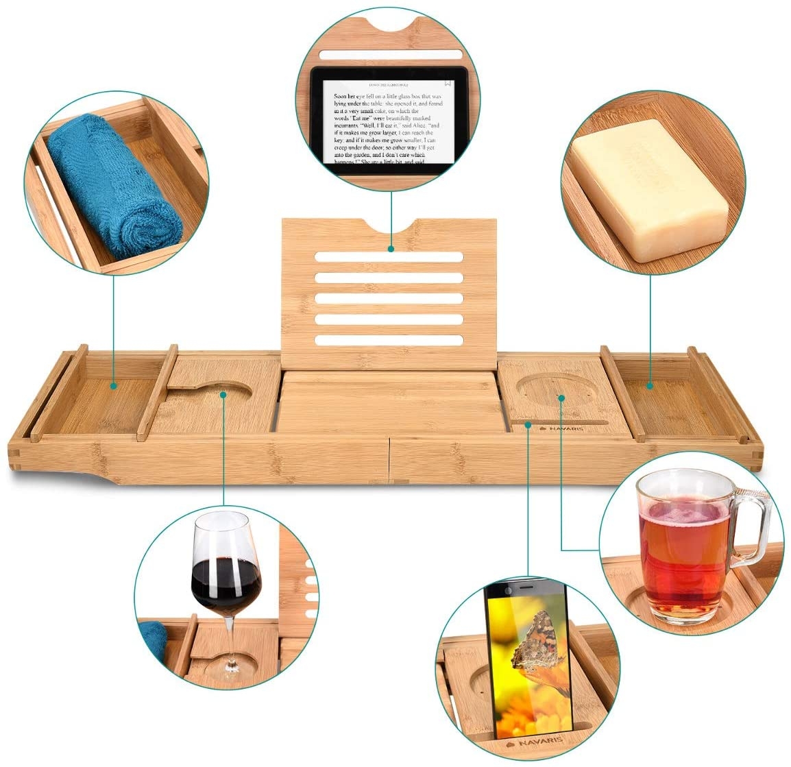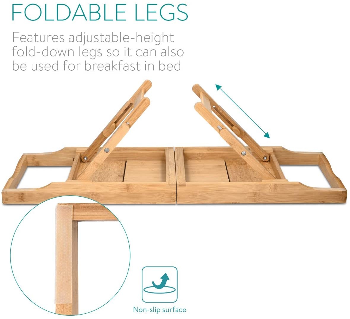 Οι πλευρές της ξύλινης βάσης επεκτείνονται προς τα έξω για τέλεια εφαρμογή στην μπανιέρα. Μπορεί επίσης, να χρησιμοποιηθεί στο κρεβάτι ως δίσκος σερβιρίσματος. Απλώς ξεδιπλώστε τα πόδια και μπορείτε να απολαύσετε ροφήματα και φαγητό, ενώ διαβάζετε ή παρακολουθείτε ταινία στο tablet σας.