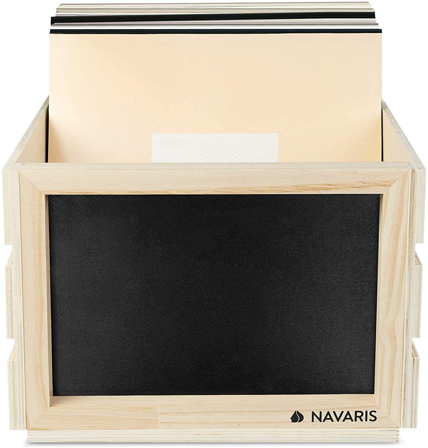 Το κουτί αποθήκευσης με μαυροπίνακα της Navaris, αποτελεί μια όμορφη και ξεχωριστή πρόταση για να οργανώσετε τα βινύλια σας, καθώς μπορεί να χωρέσει από 50 έως 80 δίσκους, ανάλογα με το πάχος, αλλά και τα διάφορα μικροαντικείμενά σας!