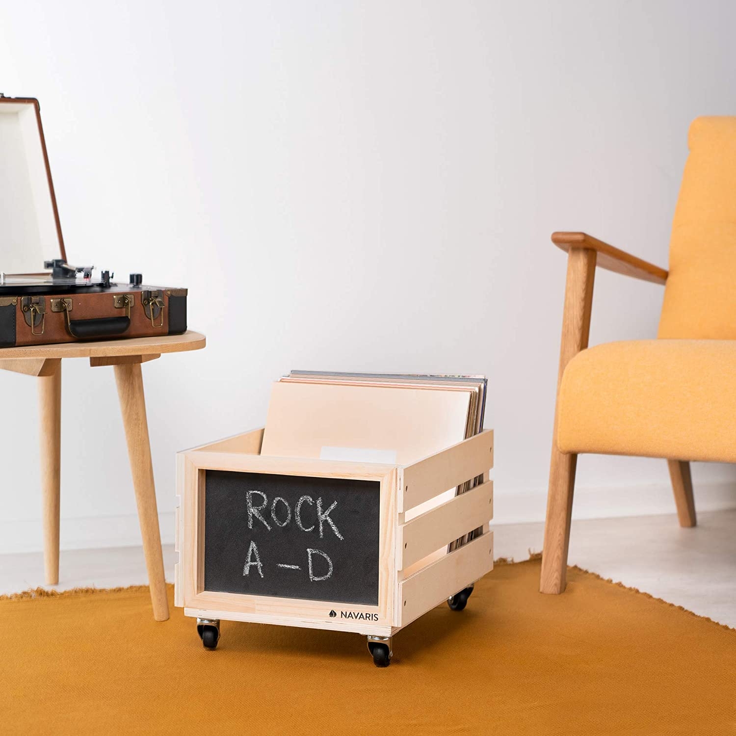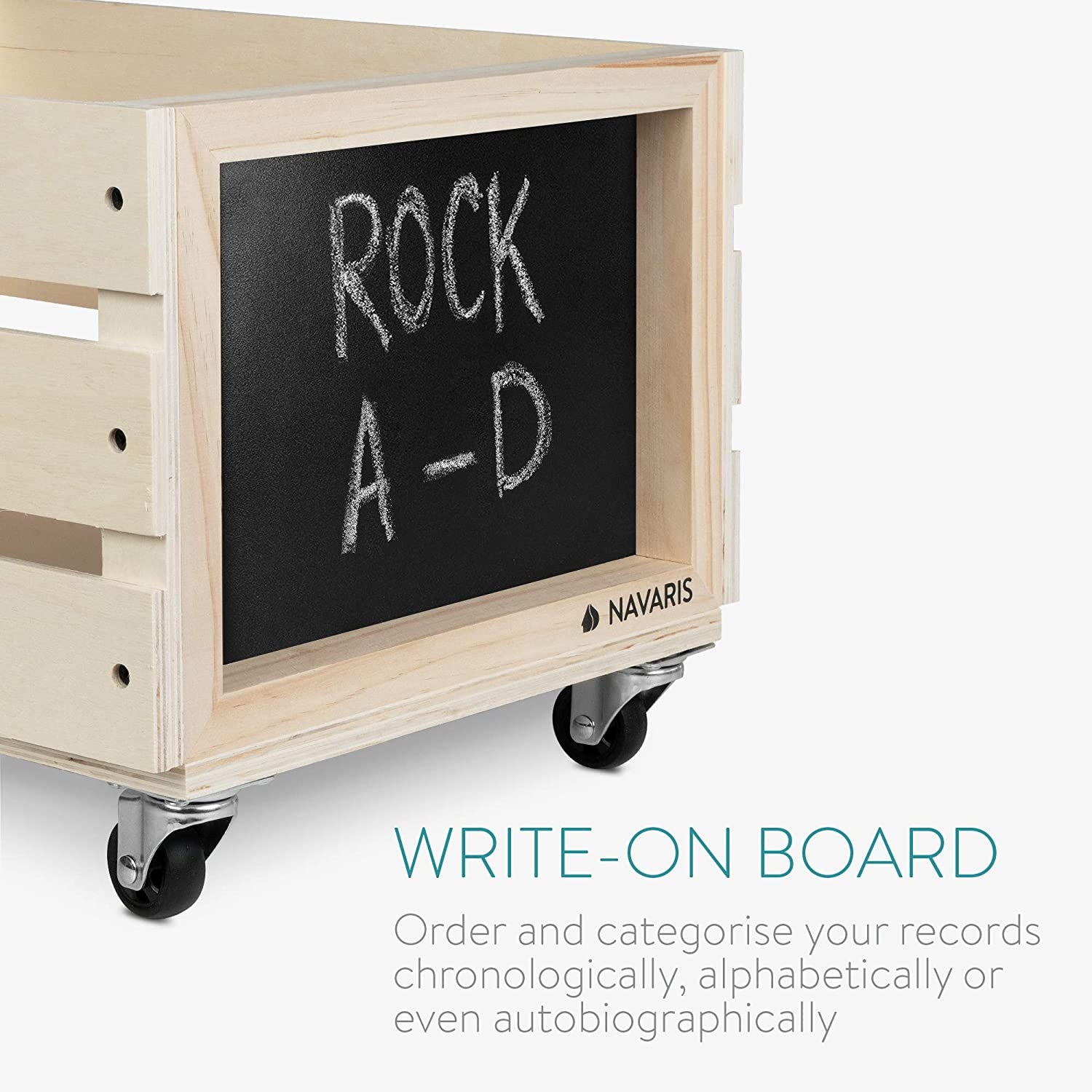 Το κουτί αποθήκευσης με ρόδες και μαυροπίνακα της Navaris, αποτελεί μια όμορφη και ξεχωριστή πρόταση για να οργανώσετε τα βινύλια σας, καθώς μπορεί να χωρέσει από 50 έως 80 δίσκους, ανάλογα με το πάχος, αλλά και τα διάφορα μικροαντικείμενά σας!