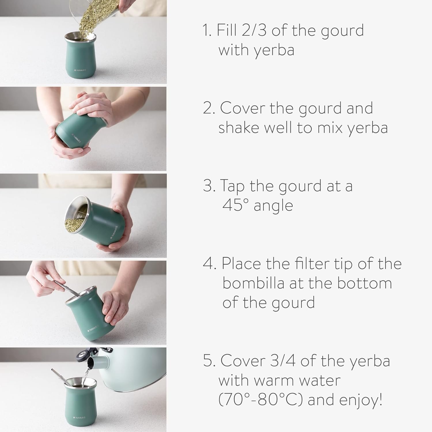 Η προετοιμασία είναι εύκολη και γίνεται με μεράκι. Απλά γεμίστε την κούπα στα 2/3 με Yerba Mate και ανακινήστε ελαφρώς για να αναμιχθούν τα αρώματα. Γείρετε το φλιτζάνι κατά 45° και τοποθετήστε το καλαμάκι με τέτοιο τρόπο, ώστε η άκρη του να βρίσκεται στον πάτο. Έπειτα, γεμίστε με ζεστό νερό, 70° - 80°C, μέχρι να γεμίσει τα 3/4 του φλιτζανιού και είστε έτοιμοι να απολαύσετε την αγαπημένη σας μοναδική εμπειρία τσαγιού mate.