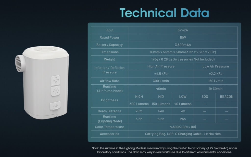 Επίσης, ενσωματώνει επαναφορτιζόμενη μπαταρία Li-ion μεγάλης χωρητικότητας 3600mAh, η οποία μετά από πλήρη φόρτιση μπορεί να λειτουργεί για 40 λεπτά στην υψηλή πίεση και 90 λεπτά στην χαμηλή πίεση. Μετά από μία πλήρη φόρτιση, είναι ικανό να φουσκώσει και να ξεφουσκώσει οκτώ διπλά φουσκωτά στρώματα, πέντε φουσκωτές βάρκες θαλάσσης, τριάντα οκτώ φουσκωτά στρόγγυλα σωσίβια θαλάσσης ενηλίκων και τριάντα σακούλες κενού για ρούχα.