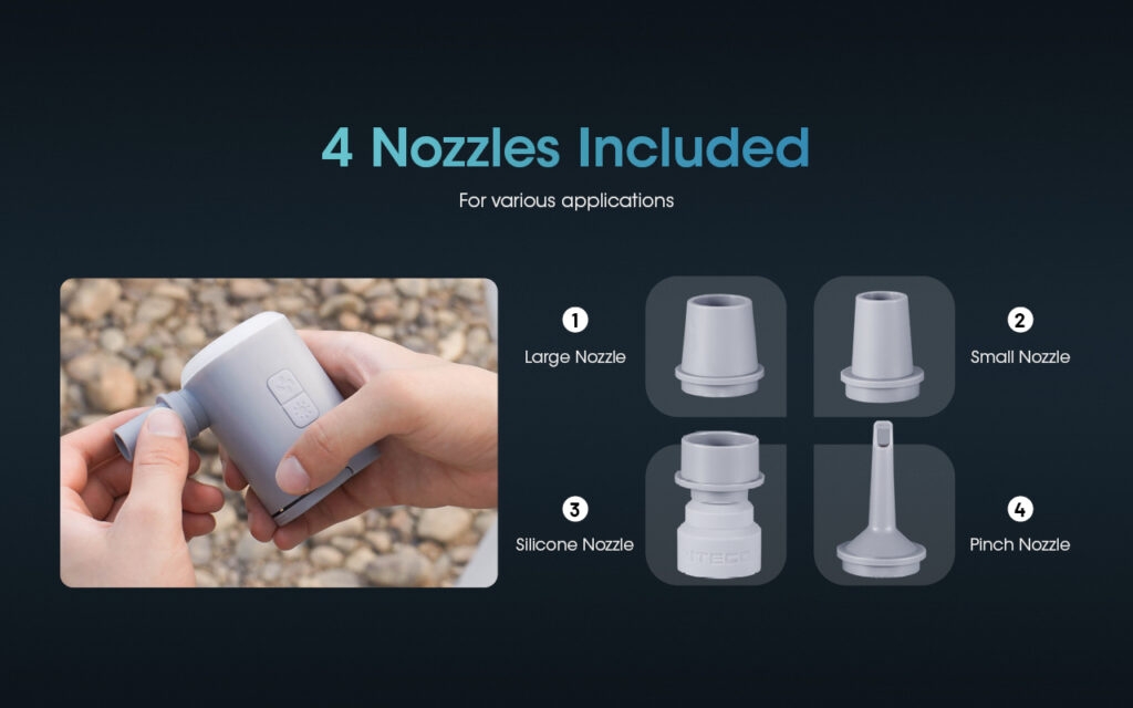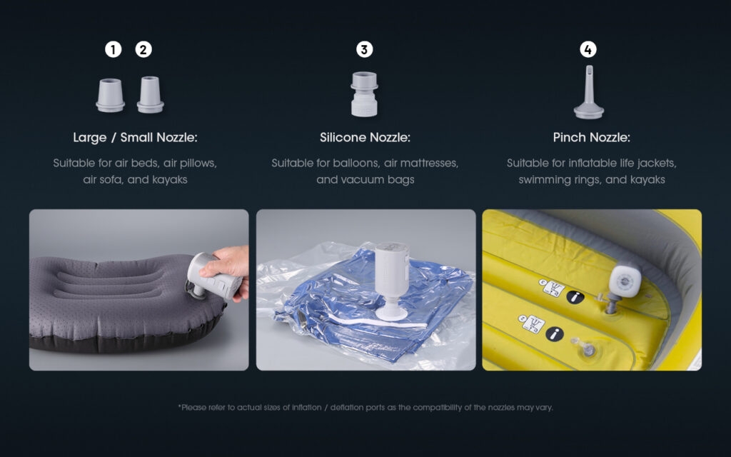 Τα ακροφύσια μεγάλης και μικρής διαμέτρου, είναι ιδανικά για αέρομαξιλάρια, αεροστρώματα και φουσκωτές βάρκες. Το ακροφύσιο σιλικόνης, είναι ιδανικό για μπαλόνια, στρώματα θαλάσσης και σακούλες κενού για ρούχα. Το ακροφύσιο συμπίεσης, είναι ιδανικό για το φούσκωμα σωσίβιων γιλέκων, σωσιβίων θαλάσσης και για το πάτωμα στις φουσκωτές βάρκες.