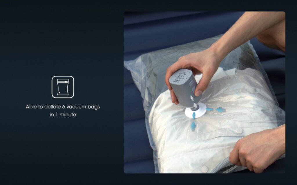 Προσφέρει γρήγορη αφαίρεση αέρα και γρήγορο ξεφούσκωμα, ώστε να βελτιστοποιεί το χώρο και να εξοικονομεί χρόνο. Ένα παράδειγμα αφαίρεσης αέρα, είναι ότι έχει την δυνατότητα να αφαιρέσει τον αέρα από μία ειδική σακούλα κενού, για τα ρούχα, μέσα σε 1′ λεπτό. Επίσης, στη συσκευασία περιλαμβάνονται 4 εναλλασσόμενες μύτες για διάφορες εφαρμογές και είναι, μεγάλης διαμέτρου ακροφύσιο Β, μικρής διαμέτρου ακροφύσιο Γ, ακροφύσιο σιλικόνης Δ και αροφύσιο συμπίεσης.