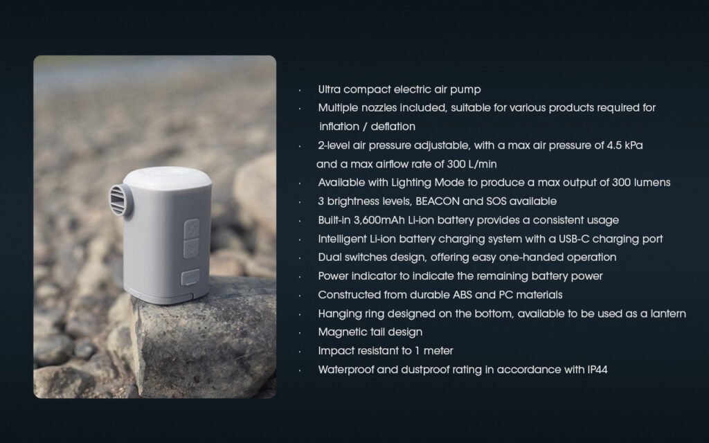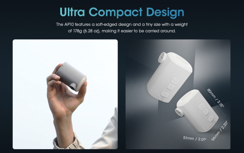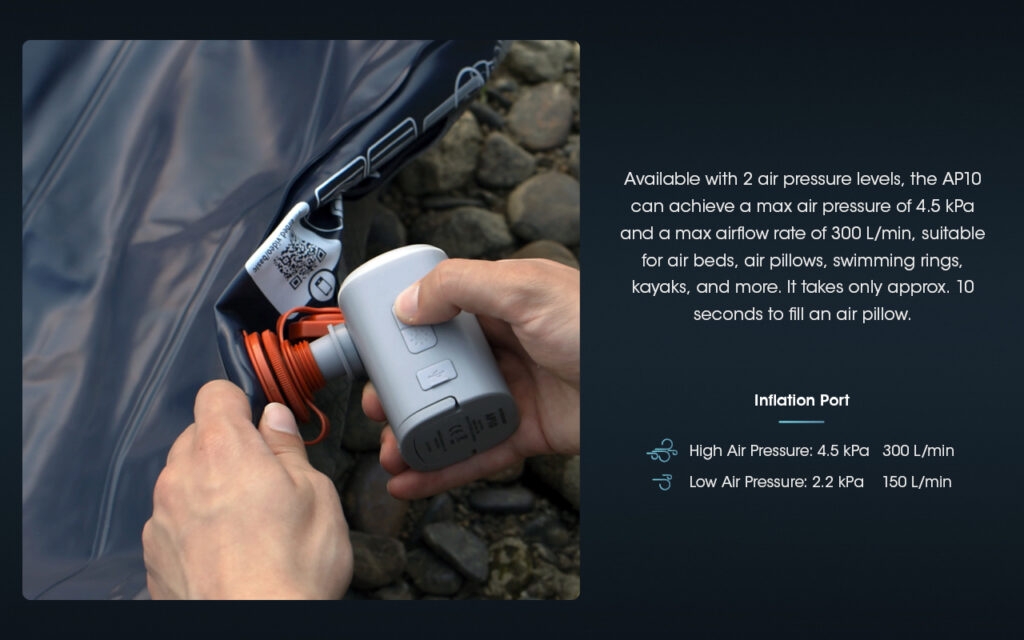 Η AP10 της Nitecore είναι μία εξαιρετικά συμπαγής ηλεκτρική αντλία αέρα, η οποία σας προσφέρει πλήρωση και άδειασμα, δηλαδή εισαγωγή και εξαγωγή αέρα, ενώ ταυτόχρονα διαθέτει και λειτουργία φωτισμού. Είναι κατασκευασμένο με εξαιρετικά συμπαγή σχεδιασμό, χωρίς ακμές, πολύ μικρό μέγεθος και βάρος 178g που το καθιστούν πολύ εύκολο στην μεταφορά.