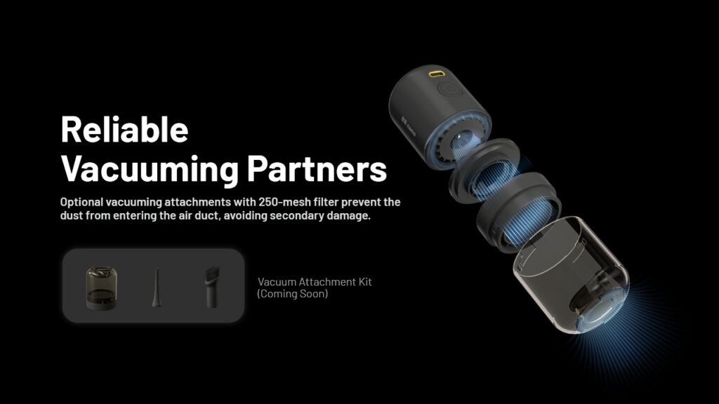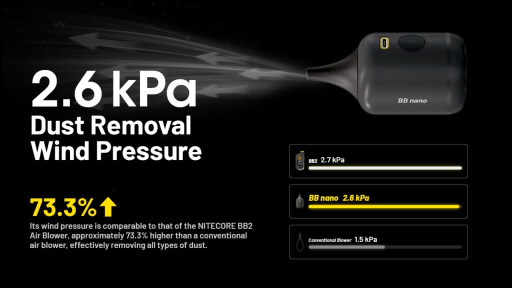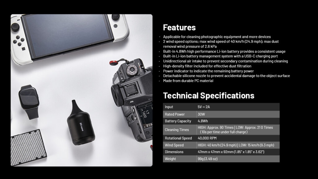 Επιπλέον, διαθέτει ενσωματωμένη επαναφορτιζόμη μπαταρία Li-ion συνολικής χωρητικότητας 4,8Wh, η οποία προσφέρει περίπου 90 καθαριστικά φυσήματα στην υψηλή ταχύτητα και περίπου 210 καθαριστικά φυσήματα στην χαμηλή ταχύτητα.