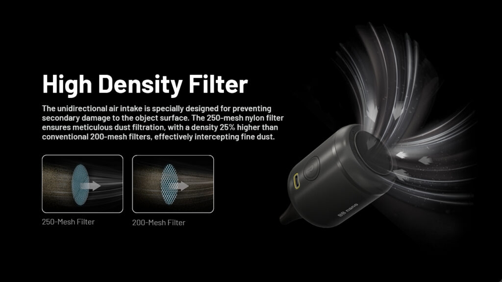 Το 250 mesh νάιλον φίλτρο εξασφαλίζει το σχολαστικό φιλτράρισμα σκόνης, με πυκνότητα 25% υψηλότερη από τα συμβατικά φίλτρα 200 mesh, παρεμποδίζοντας αποτελεσματικά τη λεπτή σκόνη. Επίσης, είναι σχεδιασμένο με ενδείξεις ισχύος, δηλαδή πράσινο χρώμα σημαίνει ότι η ενέργεια στις μπαταρίες βρίσκεται πάνω από το 50%, μπλε χρώμα η ενέργεια στις μπαταρίες βρίσκεται κάτω από το 50%, κόκκινο χρώμα η ενέργεια στις μπαταρίες βρίσκεται κάτω από το 10%.