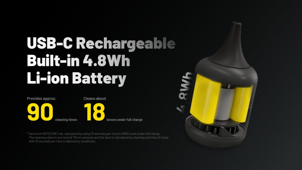 Δηλαδή μπορούν να παρέχουν ενέργεια για τον καθαρισμό 18 φακών φωτογραφικών μηχανών μετά από πλήρη φόρτιση. Σημειώστε ότι τα παραπάνω δεδομένα έχουν μετρηθεί στα εργαστήρια της Nitecore χρησιμοποιώντας την υψηλή ένταση για 10 δευτερόλεπτα κάθε φορά και μετά από πλήρη φόρτιση, ενώ ο καθαριζόμενος φακός είναι ένας κοινός φωτογραφικός φακός 72mm και τα δεδομένα έχουν υπολογιστεί καθαρίζοντας κάθε φακό από 5 φορές για 10 δευτερόλεπτα την κάθε φορά.