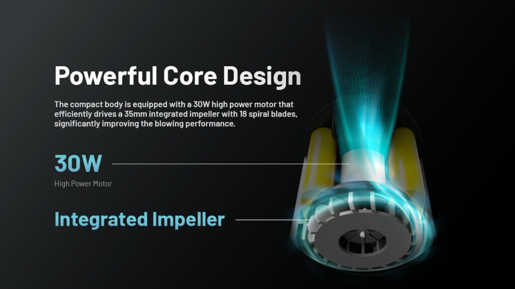 Η μέγιστη ταχύτητα αέρα φθάνει τα 40 km/h και είναι διαθέσιμο για άμεση χρήση και για την επίτευξη του συνεχούς καθαρισμού, βελτιώνοντας αποτελεσματικά την διαδικασία καθαρισμού. Εξασκεί ισχυρή πίεση αέρα της τάξεως των 2,6Kpa, ικανή να διώξει την σκόνη και αυξημένη πίεση κατά 73,3% σε σχέση με τους κοινούς χειροκίνητους φυσητήρες.