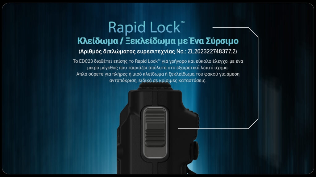 Το Rapid Lock κλείδωμα (Αριθμός διπλώματος ευρεσιτεχνίας No. ZL202322748377.2) επιτρέπει την εύκολη ασφαλή αποθήκευση του φακού, αποτρέποντας τυχαίες ενεργοποιήσεις, ενώ ο χειρισμός του παραμένει απλός και αξιόπιστος. Απλά σύρετε για πλήρες ή μισό κλείδωμα ή ξεκλείδωμα του φακού για άμεση ανταπόκριση, ειδικά σε κρίσιμες καταστάσεις. Στη λειτουργία μισού κλειδώματος, το κουμπί ενεργοποίησης είναι κλειδωμένο, ενώ το κουμπί λειτουργιών είναι διαθέσιμο για άμεση πρόσβαση στην Turbo / Strobe. Στη λειτουργία πλήρους κλειδώματος και τα δύο κουμπιά δεν είναι διαθέσιμα για την ενεργοποίηση του φακού, ιδανικά για αποθήκευση ή μεταφορά.