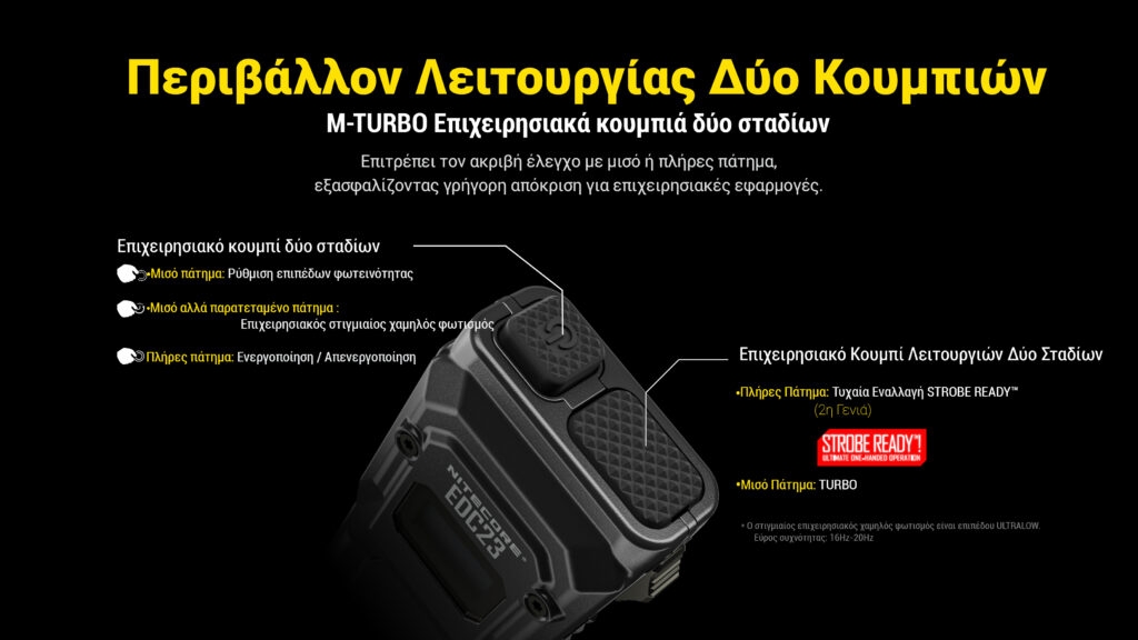Ο φακός διαθέτει επίσης συστήματα ταχείας ρύθμισης φωτεινότητας μέσω του διπλού κουμπιού M-Turbo λειτουργιών δύο σταδίων, προσφέροντας άμεση πρόσβαση σε λειτουργίες Turbo και Strobe, ιδανικές για κρίσιμες καταστάσεις. Επιτρέπει τον ακριβή έλεγχο με μισό ή πλήρες πάτημα, εξασφαλίζοντας γρήγορη απόκριση για επιχειρησιακές εφαρμογές. Μισό πάτημα για ρύθμιση επιπέδων φωτεινότητας. Μισό αλλά παρατεταμένο πάτημα για επιχειρησιακό στιγμιαίο χαμηλό φωτισμό. Πλήρες πάτημα για ενεργοποίηση και απενεργοποίηση. Πλήρες πάτημα για τυχαία εναλλαγή Strobe Ready και μισό πάτημα για Turbo.