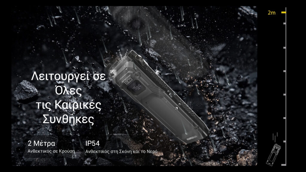 Ο φακός είναι αδιάβροχος με προστασία IP54 και ανθεκτικός σε πτώσεις έως 2 μέτρα, καθιστώντας τον έτοιμο για κάθε περιβάλλον και καιρική συνθήκη. Διαθέτει σχεδιασμό εξοικονόμησης ενέργειας, πάχυνσης και αντιεκρηκτικής προστασίας, που αντιστέκεται αποτελεσματικά σε κραδασμούς και χτυπήματα. Πιέστε το κουμπί λειτουργιών έως το μέσον της διαδρομής του για να ρυθμίσετε το επίπεδο φωτεινότητας πριν από την ενεργοποίηση, ώστε να ταιριάζει σε διαφορετικές επιχειρησιακές καταστάσεις. Οι προσαρμοσμένες ρυθμίσεις βοηθούν επίσης στην αποφυγή του υπερβολικού φωτισμού κατά την καθημερινή χρήση.