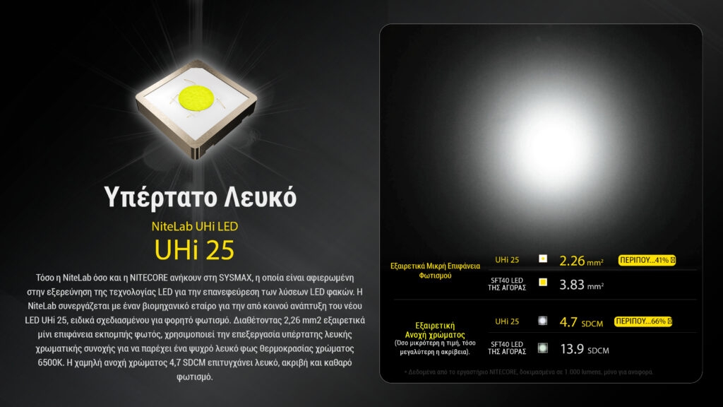 Με βάρος μόλις 101 γραμμάρια, ο EDC23 προσφέρει αξεπέραστη φορητότητα και ευκολία αποθήκευσης, χωράει άνετα σε τσέπες ή ζώνες, ενώ είναι κατάλληλος για καθημερινή μεταφορά EDC και ειδικές αποστολές. Τόσο η Nitelab όσο και η Nitecore ανήκουν στη Sysmax, η οποία είναι αφιερωμένη στην εξερεύνηση της τεχνολογίας LED για την επανεφεύρεση των λύσεων LED φακών. Η Litelab συνεργάζεται με έναν βιομηχανικό εταίρο για την από κοινού ανάπτυξη του νέου LED UHi 25, ειδικά σχεδιασμένο για φορητό φωτισμό. Διαθέτοντας 2,26 mm2 εξαιρετικά μίνι επιφάνεια εκπομπής φωτός, χρησιμοποιεί την επεξεργασία υπέρτατης λευκής χρωματικής συνοχής για να παρέχει ένα ψυχρό λευκό φως θερμοκρασίας χρώματος 6500K. Η χαμηλή ανοχή χρώματος 4,7SDCM επιτυγχάνει λευκό, ακριβή και καθαρό φωτισμό.