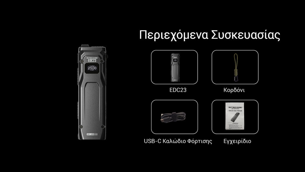Η συσκευασία περιλαμβάνει: 1 x Φακός EDC23, 1 x Καλώδιο φόρτισης Type-C, 1 x Λουράκι καρπού, 1 x Εγχειρίδιο οδηγιών.