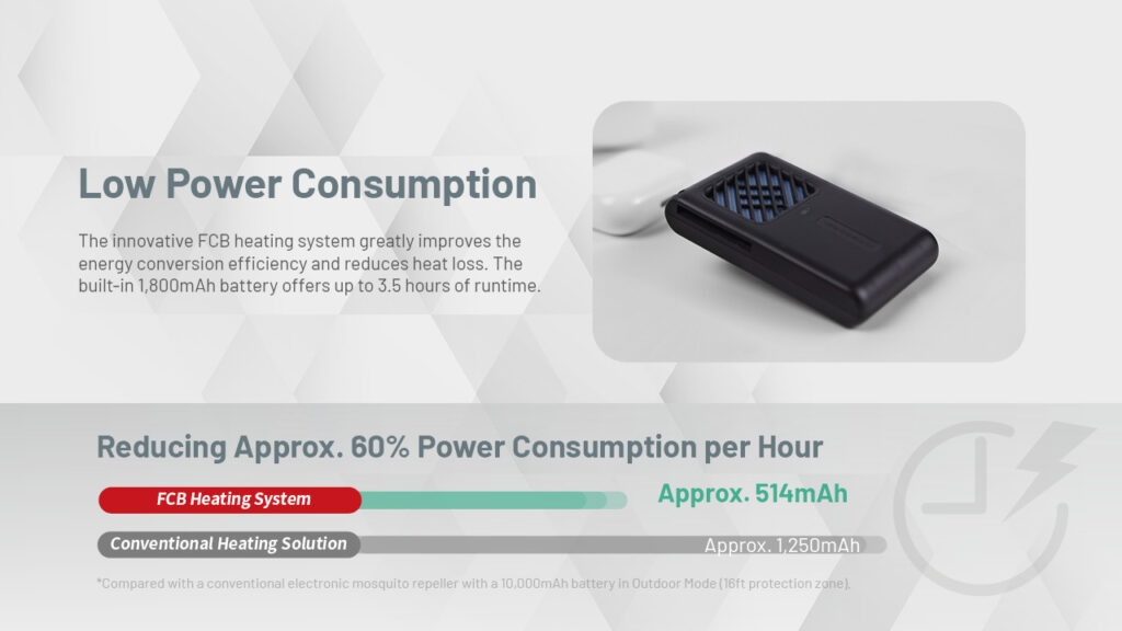 Το καινοτόμο σύστημα θέρμανσης FCB βελτιώνει σημαντικά την μεταβολή της ενέργειας και μειώνει την απώλεια θερμοκρασίας αποτελεσματικά. Η ενσωματωμένη επαναφορτιζόμενη μπαταρία Li-ion 1800mAh παρέχει έως και 3.5 ώρες λειτουργίας. Μειώνει περίπου 60% την κατανάλωση ενέργειας, καθώς το σύστημα θέρμανσης FCB έχει κατανάλωση περίπου 514mAh, ενώ ένα κοινό σύστημα θέρμανσης έχει κατανάλωση περίπου 1250mAh.