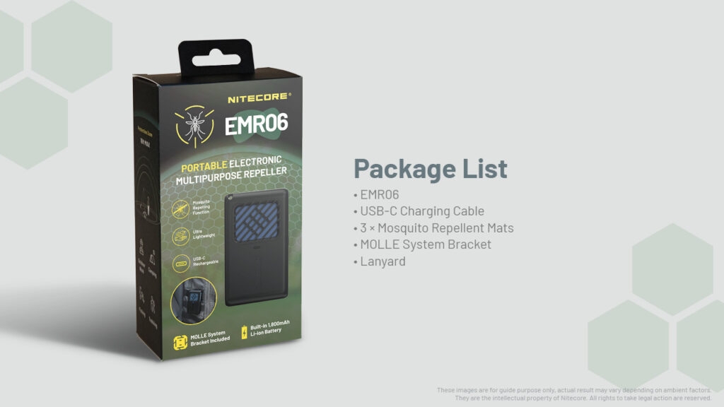 Η συσκευασία περιλαμβάνει: 1 x Συσκευή EMR06, 1 x Καλώδιο φόρτισης Type-C, 3 x Ταμπλέτες απώθησης κουνουπιών, 1 x Βάση στερέωσης σε συστήματα ανάρτησης MOLLE, 1 x Λουράκι καρπού.