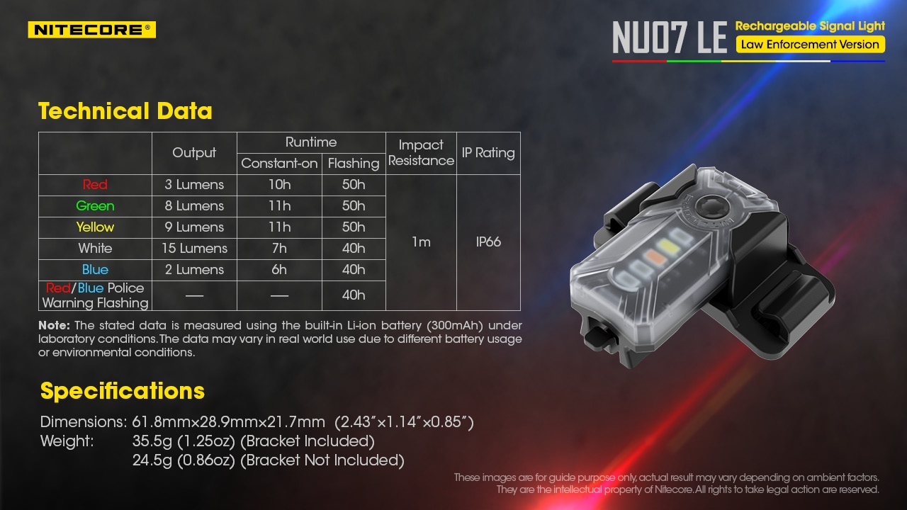 Ο επαναφορτιζόμενος φακός προειδοποιητικών σημάτων της Nitecore είναι ειδικά σχεδιασμένος για τα σώματα ασφαλείας, διαθέτει 11 λειτουργίες, 5 πηγές φωτισμού LED, κόκκινο, πράσινο, κίτρινο, λευκό, μπλε και 50 ώρες μέγιστης διάρκειας λειτουργίας.