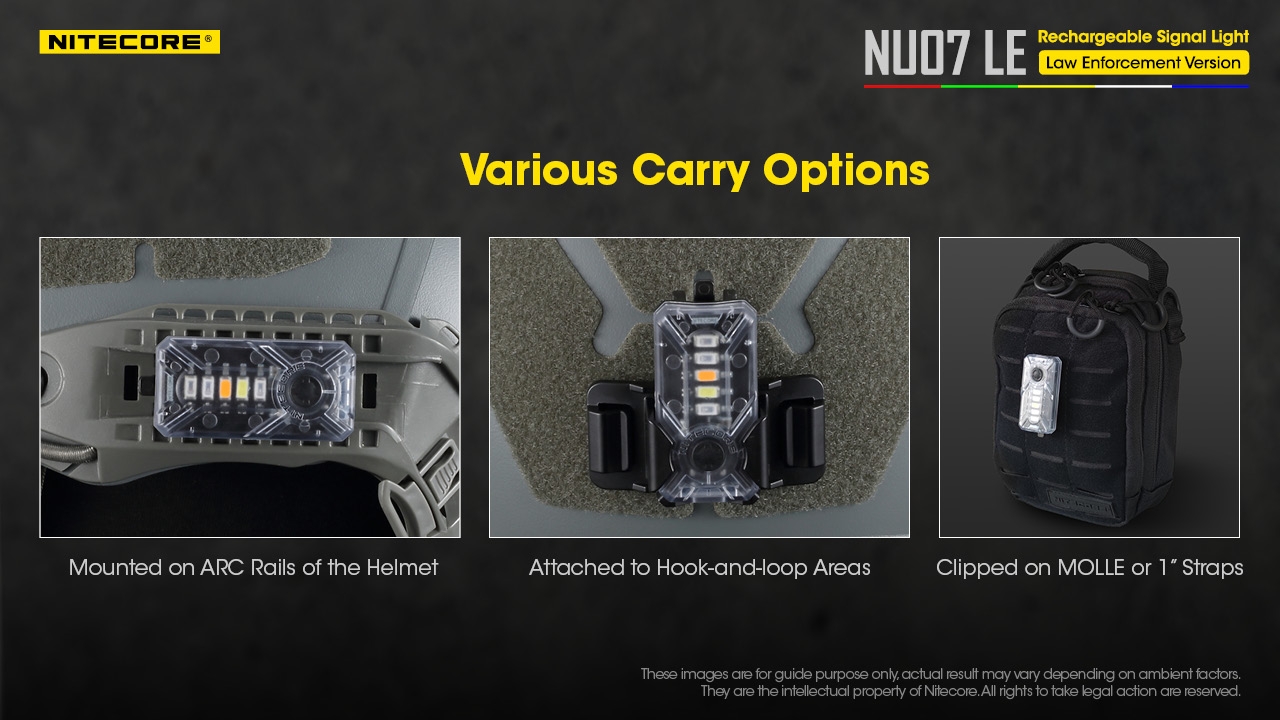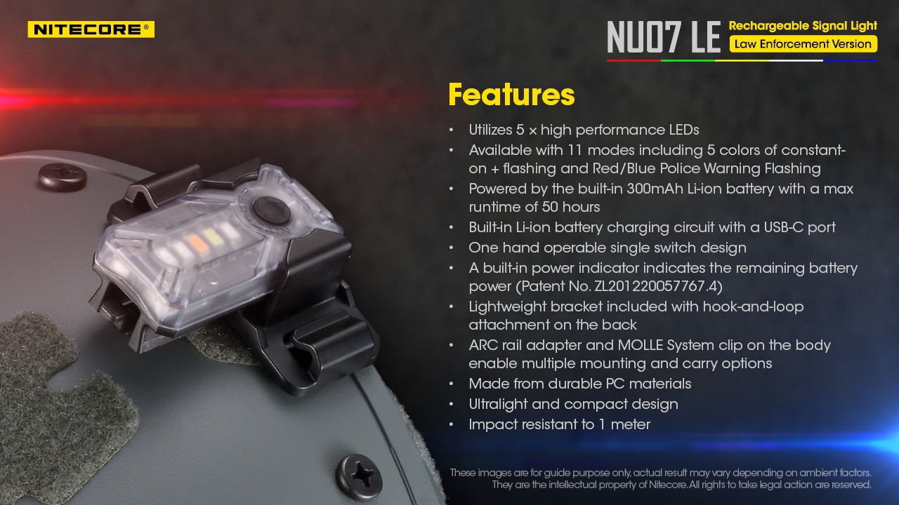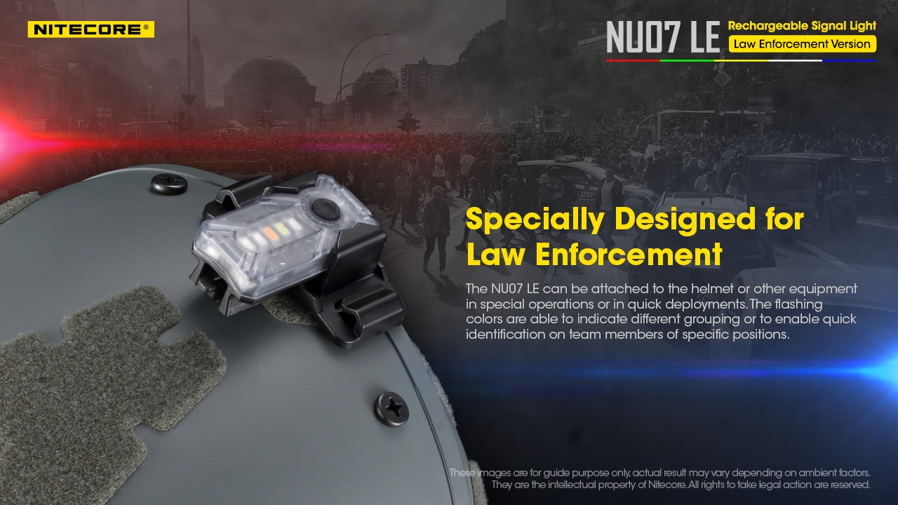 Διαθέτει σχεδιασμό κατοχυρωμένο με ευρεσιτεχνία από την Nitecore, ειδικά σχεδιασμένος για τα σώματα ασφαλείας, μπορεί να προσαρμοστεί σε κράνος ή άλλο εξοπλισμό για ειδικές επιχειρήσεις ή για γρήγορη ανάπτυξη. Οι παλλόμενοι έγχρωμοι φωτισμοί μπορούν να δείξουν διαφορετικά γκρουπ ομάδων ή επιτρέπουν γρήγορη αναγνώριση μεταξύ των μελών μίας ομάδας που λαμβάνουν διαφορετική θέση ανάλογα με το χρώμα.