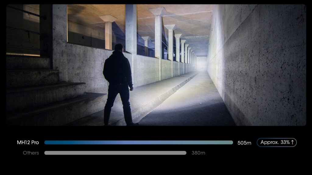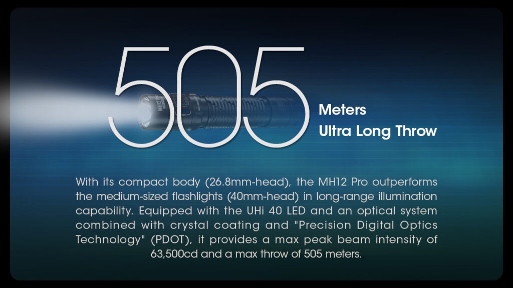 Με το συμπαγές σώμα του (26,8mm-κεφαλή), ο MH12 Pro ξεπερνά τους φακούς μεσαίου μεγέθους (με κεφαλή 40mm) σε ικανότητα φωτισμού μεγάλης εμβέλειας. Εξοπλισμένος με το LED UHi 40 και ένα οπτικό σύστημα που συνδυάζει την κρυστάλλινη επίστρωση και τεχνολογία ψηφιακών οπτικών ακριβείας (PDOT), παρέχει μέγιστη μέγιστη ένταση δέσμης 63500cd και μέγιστη εμβέλεια 505 μέτρων, περίπου 33% περισσότερο από άλλους φακούς της αγοράς που η δέσμη τους φθάνει έως και 380 μέτρα.
