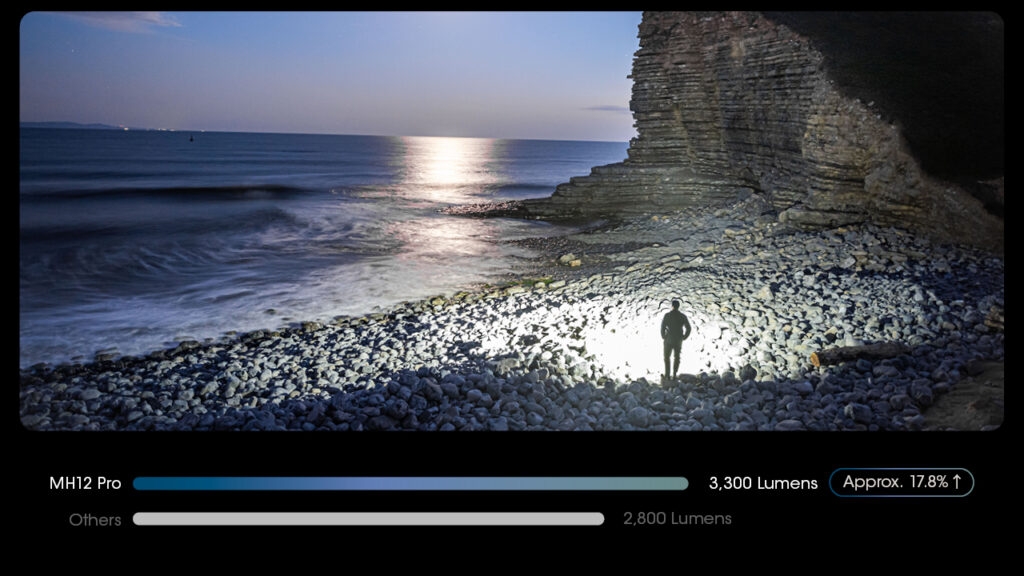 Εκτός από το εξαιρετικά μεγάλο βεληνεκές του, ο MH12 Pro αποδίδει εντυπωσιακή ισχύ φωτισμού 3300 lumens, ξεπερνώντας πολλούς άλλους φακούς μεσαίου μεγέθους στην αγορά, ιδανικούς για έκτακτη ανάγκη, νυχτερινή αναζήτηση, υπαίθριες δραστηριότητες, ελέγχους συντήρησης και πολλά άλλα. Αποδίδει μέγιστη ισχύ φωτισμού κατά 17,8% ισχυρότερη από αντίστοιχους φακούς της αγοράς με ισχύ φωτισμού τα 2800 Lumens.