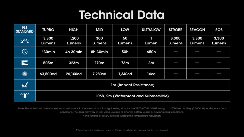 Επιπλέον, είναι εξοπλισμένος με διαισθητικές ενδεικτικές λυχνίες, για την ισχύ φωτισμού και για την ισχύ της μπαταρίας. Το σώμα είναι κατασκευασμένο με μηχανική κατεργασία ακριβείας CNC και διαθέτει αντιολισθητικές αυλακιές. Με μια υφή πάχους 1 mm, οι χρήστες μπορούν να διατηρήσουν μια ασφαλή λαβή ακόμη και με ιδρωμένα, βρεγμένα χέρια ή όταν φοράνε γάντια.