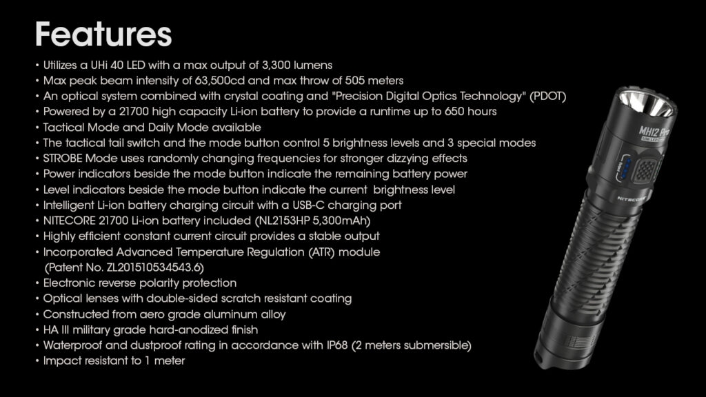 Ο MH12 Pro της Nitecore είναι ένας συμπαγής επαναφορτιζόμενος φακός μέσω της θύρας Type-C, ο οποίος προσφέρει εξαιρετική απόδοση LED UHi 40, μέγιστη απόδοση που φθάνει τα 3300 Lumens, μέγιστη απόσταση δέσμης που φθάνει τα 505 μέτρα και επαναφορτιζόμενη μπαταρία με χωρητικότητα 5300 mAh.