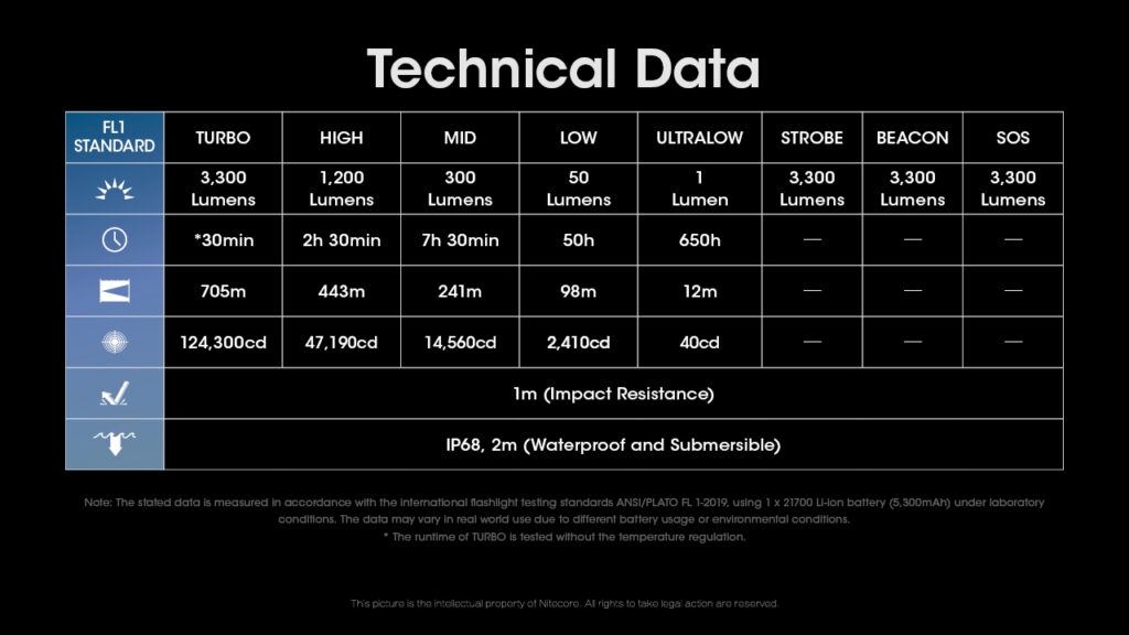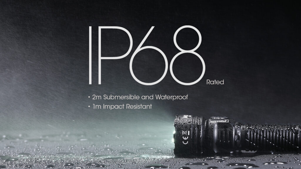 Τέλος, είναι κατασκευασμένο με υψηλής απόδοσης κύκλωμα σταθερού ρεύματος, όπου η δέσμη σταθερής φωτεινότητας χωρίς αναβοσβήματα, εγγυάται την άνετη οπτική εμπειρία. Είναι βαθμολογημένος με IP68, είναι αδιάβροχος και υποβρύχιος έως και 2 μέτρα βάθος και ανθεκτικός σε πτώσεις έως και από 1 μέτρο ύψος.