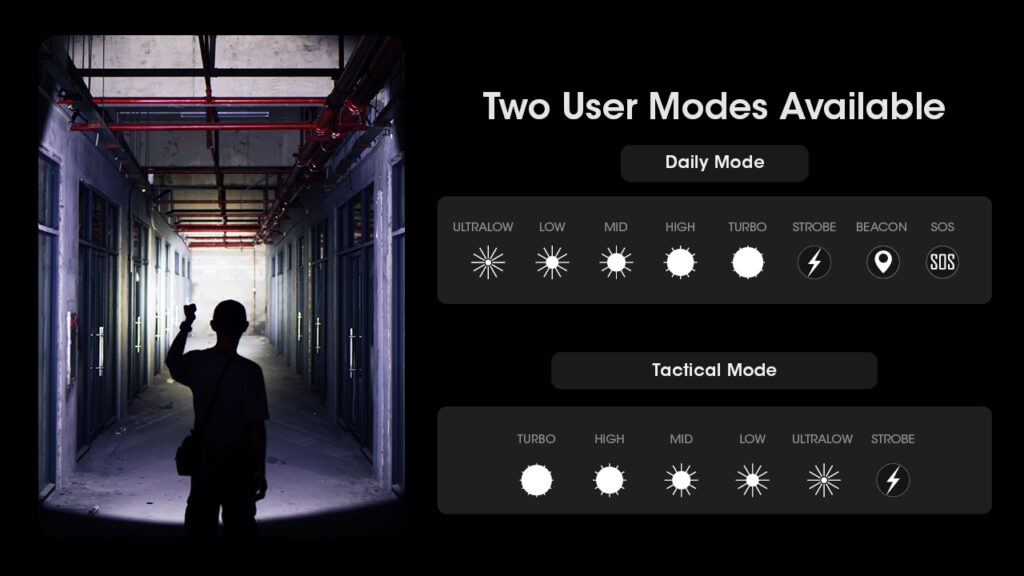 Επιπλέον, διαθέτει κουμπί λειτουργίας για ρυθμίσεις επιπέδων φωτεινότητας και ενεργοποίηση ειδικών λειτουργιών (STROBE/Beacon/SOS). Είναι σχεδιασμένο με δύο λειτουργίες χρήσης την καθημερινή λειτουργία και την επιχειρησιακή λειτουργία. Η ένταση φωτισμού στην καθημερινή λειτουργία είναι Πολύ Χαμηλή>Χαμηλή>Μεσαία>Υψηλή>TURBO>Strobe>Beacon>SOS και η ένταση φωτισμού στην επιχειρησιακή λειτουργία είναι TURBO>Υψηλή>Μεσαία>Χαμηλή>Πολύ Χαμηλή>STROBE.
