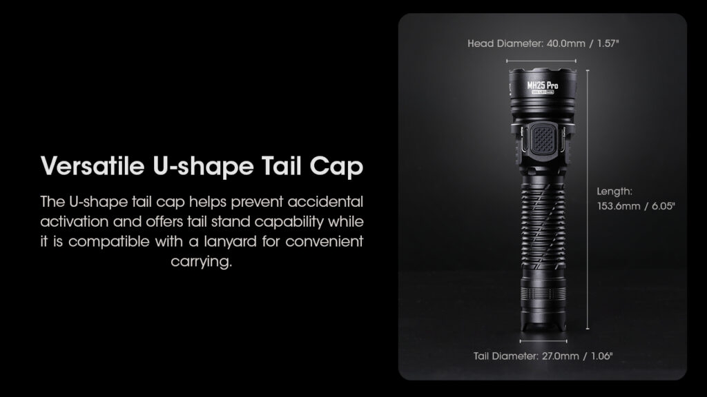 Επιπλέον, διαθέτει ένα ευέλικτο καπάκι ουράς σχήματος U, το οποίο είναι διαθέσιμο για να αποτρέψει την τυχαία ενεργοποίηση και προσφέρει τη δυνατότητα στήριξης στην ουρά του. Το καπάκι ουράς διαθέτει επίσης μια οπή για την προσάρτηση κορδονιού, ενώ ο φακός έχει διάμετρο κεφαλής 40mm, ολικό μήκος 153.60mm και διάμετρο ουράς 27,00mm.