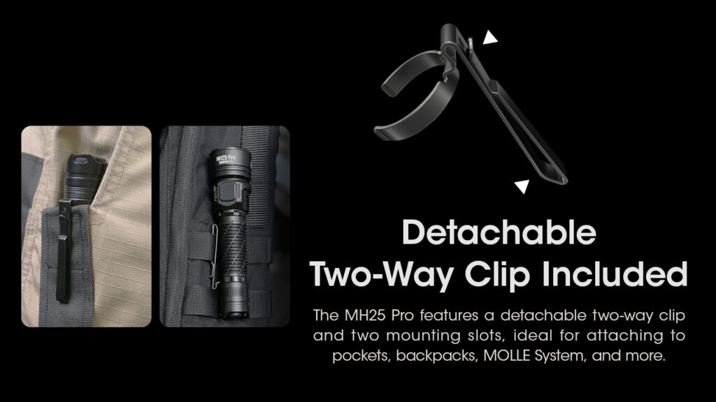 Ο MH25Pro διαθέτει ένα αποσπώμενο κλιπ διπλής κατεύθυνσης και δύο υποδοχές τοποθέτησης, ιδανικό για προσάρτηση σε τσέπες, σακίδια πλάτης, σύστημα MOLLE και άλλα. Προσφέρει φιλική προς το χρήστη λειτουργία, με επιχειρησιακό διακόπτη ουράς για ενεργοποίηση και απενεργοποίηση (on/off) και επιχειρησιακό διακόπτη στιγμιαίας ενεργοποίησης.