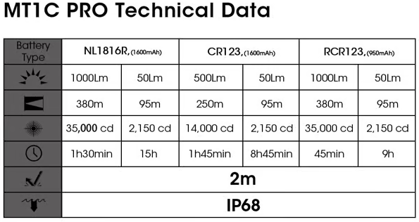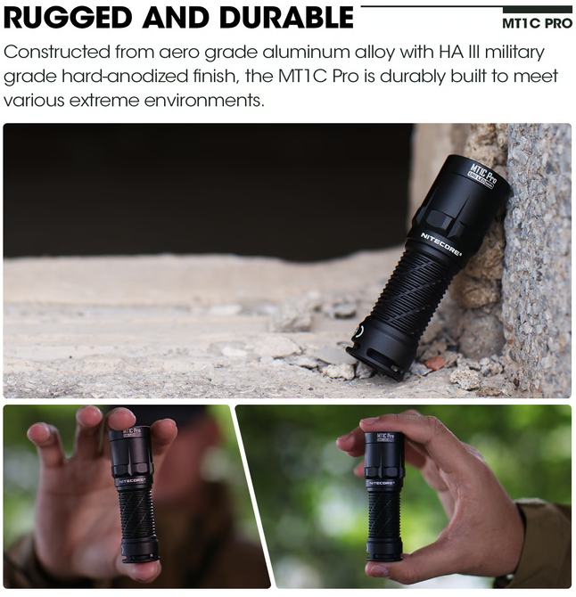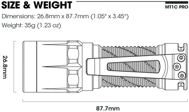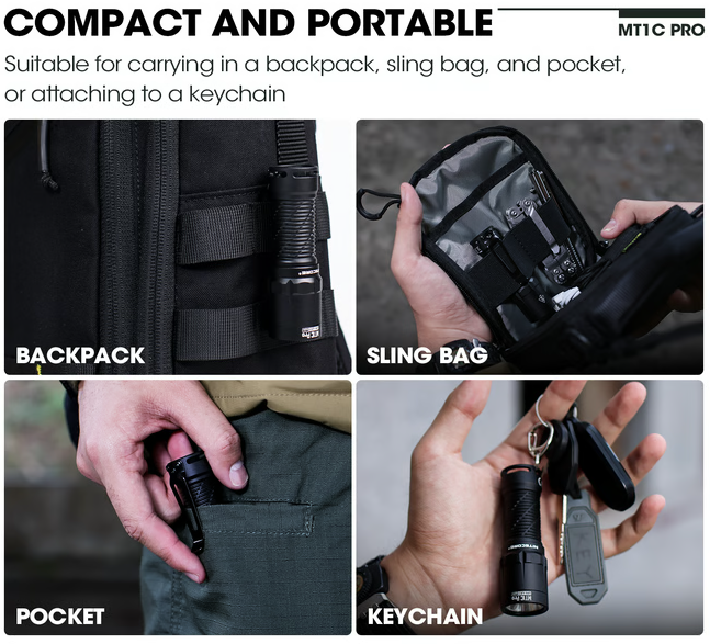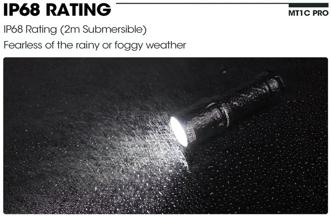 Με βάρος μόλις 80 gr συμπεριλαμβανομένης της μπαταρίας, ο MT1C Pro είναι εξαιρετικά φορητός και χωράει άνετα στην τσέπη σας. Επιπλέον, το κλιπ του επιτρέπει να τον στερεώσετε σε σακίδια, ζώνες ή άλλα αντικείμενα για εύκολη πρόσβαση. Ο φακός είναι επίσης απίστευτα ανθεκτικός, με αντοχή σε κρούσεις έως και 2 μέτρα και βαθμολογία αδιαβροχοποίησης IP68, εξασφαλίζοντας αξιόπιστη απόδοση σε οποιεσδήποτε συνθήκες.
